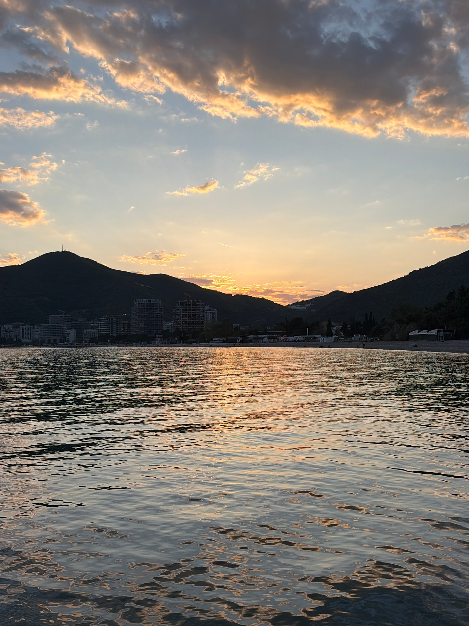 The image depicts a serene sunset over the Adriatic Sea in Budva, Montenegro, featuring a captivating blend of natural landscape and urban development. In the foreground, the calm surface of the sea…read more