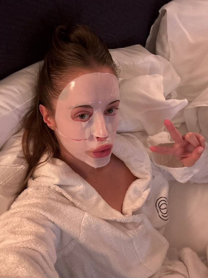A woman lies on a bed covered with white bedding, wearing a white bathrobe. She has a sheet mask applied to her face. Her head is tilted to the side, and she's looking directly at the camera. Her righ…read more