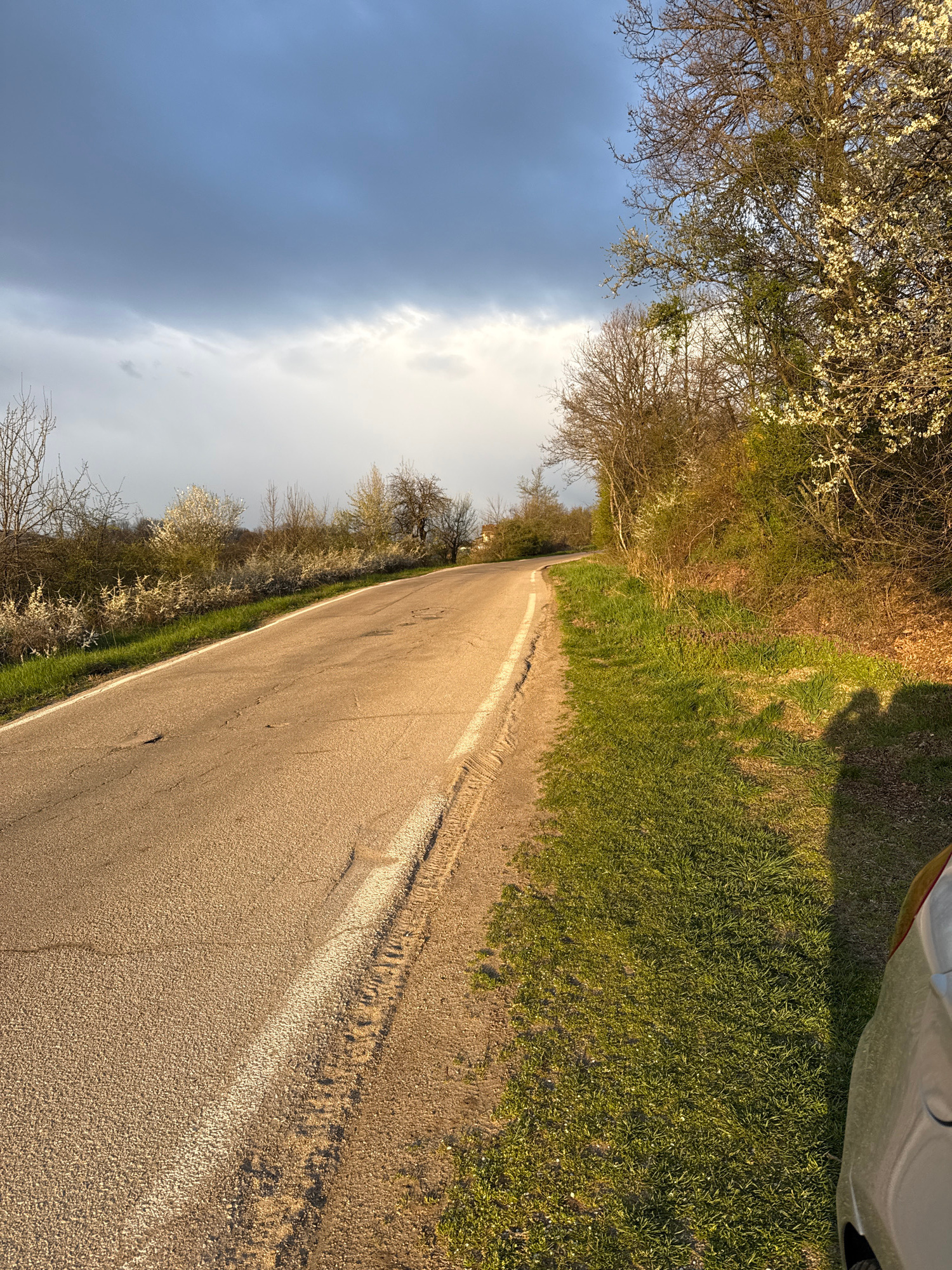 The image depicts a rural road in Balinovtsi, Bulgaria. The asphalt road stretches into the distance, bordered by green grass and vegetation on one side, and trees and shrubs on the other. A white lin…read more