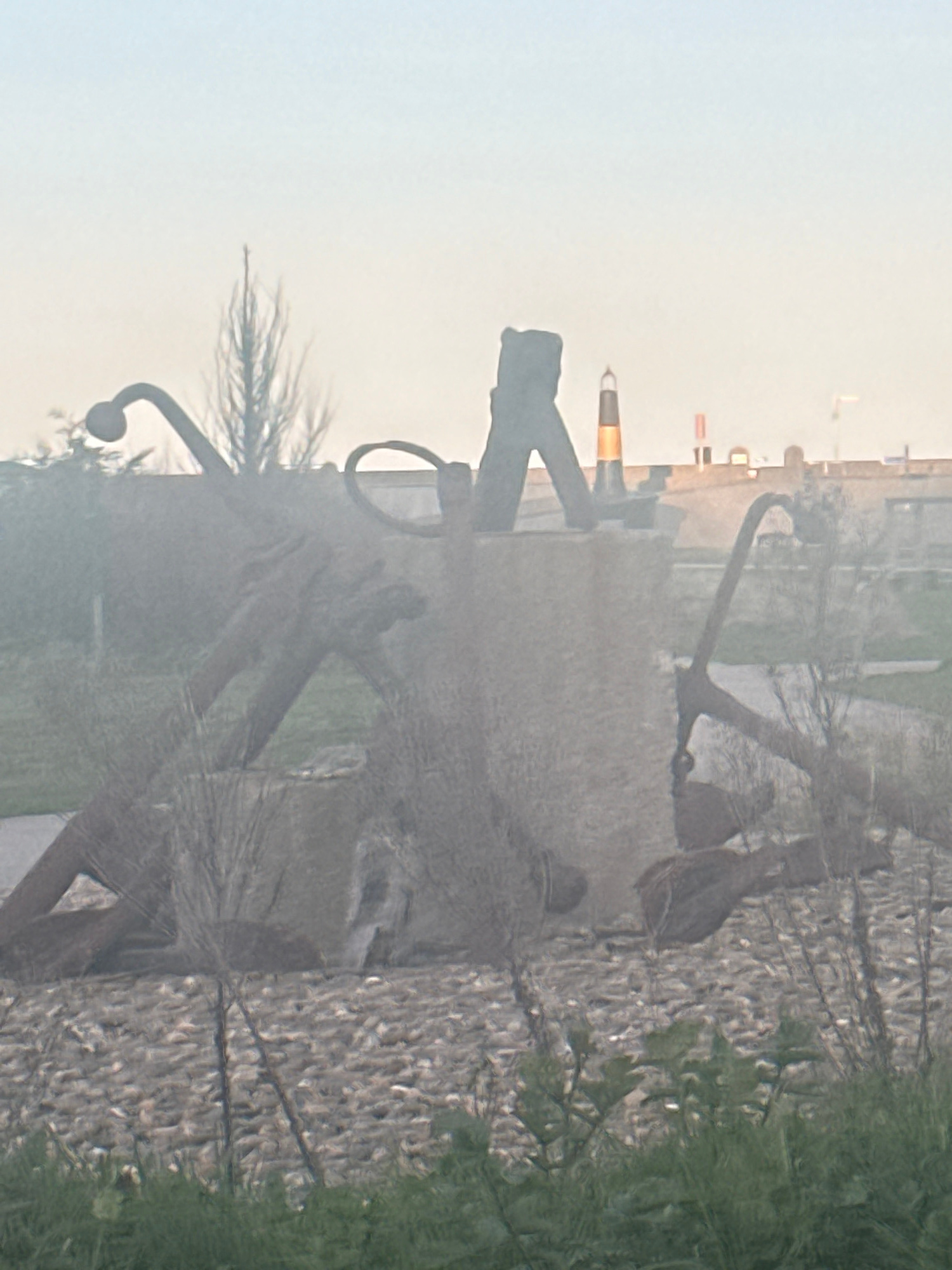 The image depicts a blurry outdoor scene in East Suffolk, United Kingdom. A metal structure, possibly an artistic installation or part of a playground, is prominently featured in the foreground. The g…read more