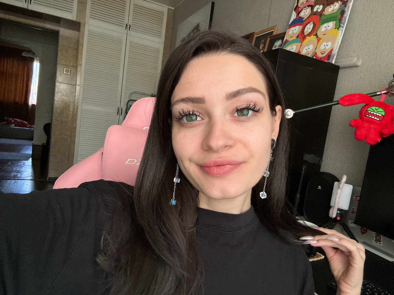 The image is a selfie of a young woman with fair skin and dark hair, taken from an inverted perspective. She has green eyes and is wearing earrings with crystalline elements. She is wearing a black sh…read more