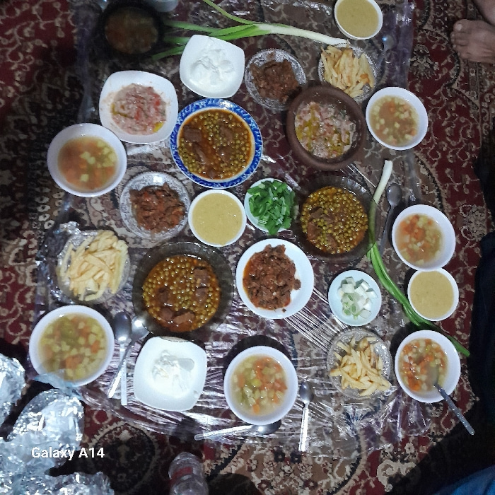 This image depicts a communal meal arranged on a floor in a domestic setting within the city of Khan Yunis, Palestinian Territory. The meal is spread across a clear plastic sheet overlaying a patterne…read more