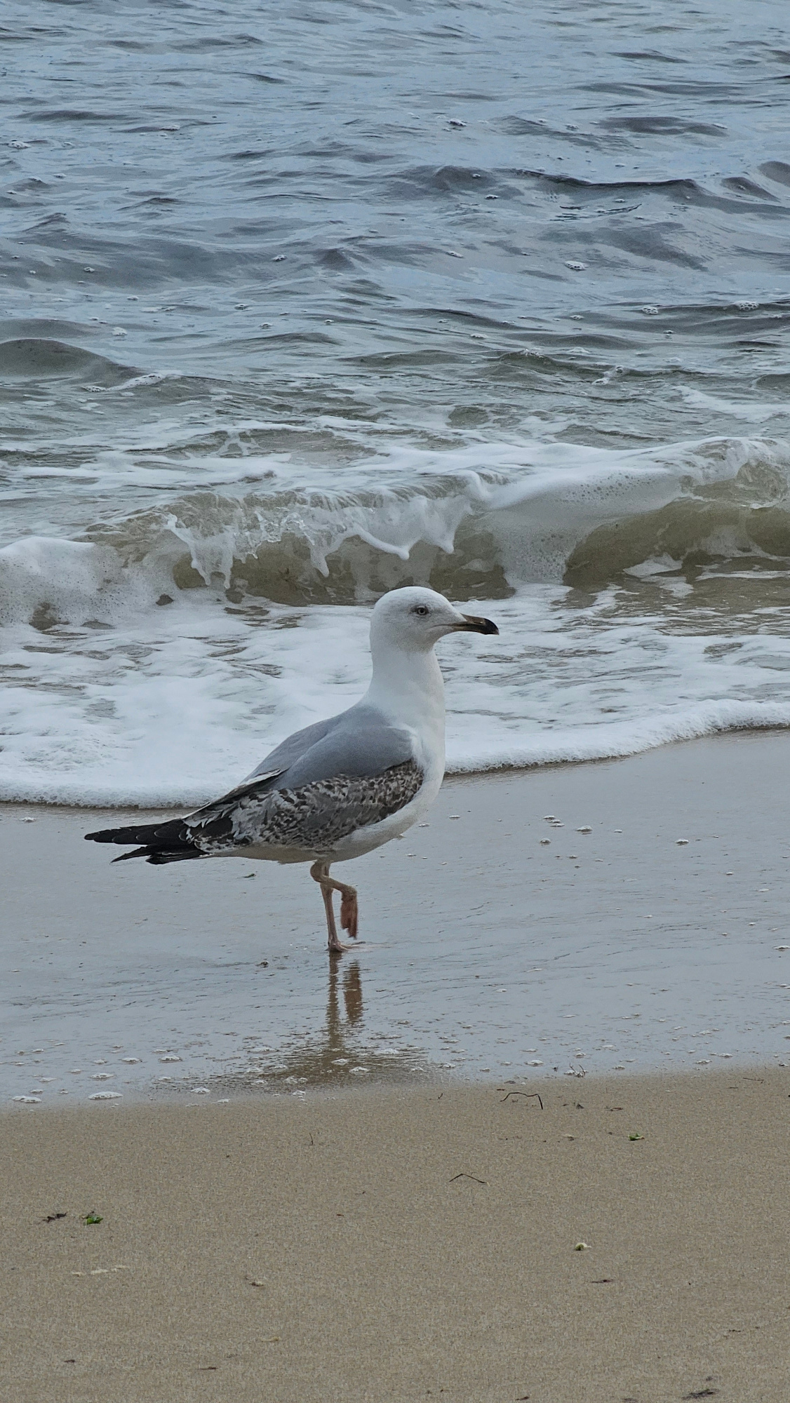 A seagull stands on a beach at the edge of the water in Varna, Bulgaria. The bird has a white head and body with grey and speckled wings and a black tail. The beach is sand colored on the right. The w…read more