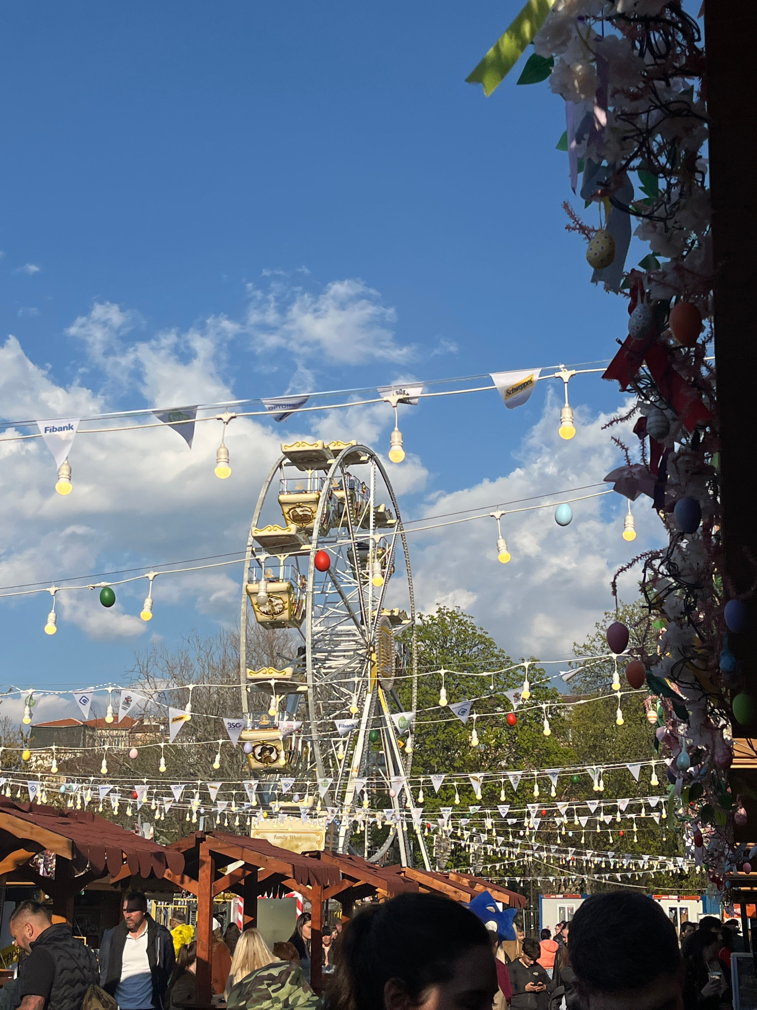 The image depicts a lively outdoor scene, likely a spring festival or market, under a bright blue sky with scattered white clouds, suggesting clear daytime weather. The perspective looks up through an…read more