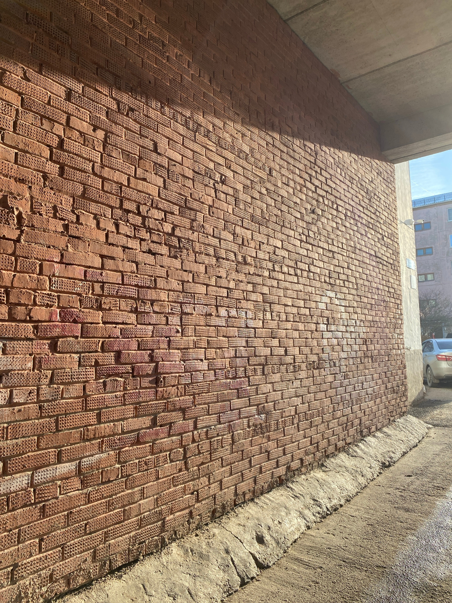 The image depicts a brick street, likely a pedestrian walkway, under an overpass or bridge. The bricks are red and arranged in a running bond pattern. They have a textured surface with small holes. Th…read more