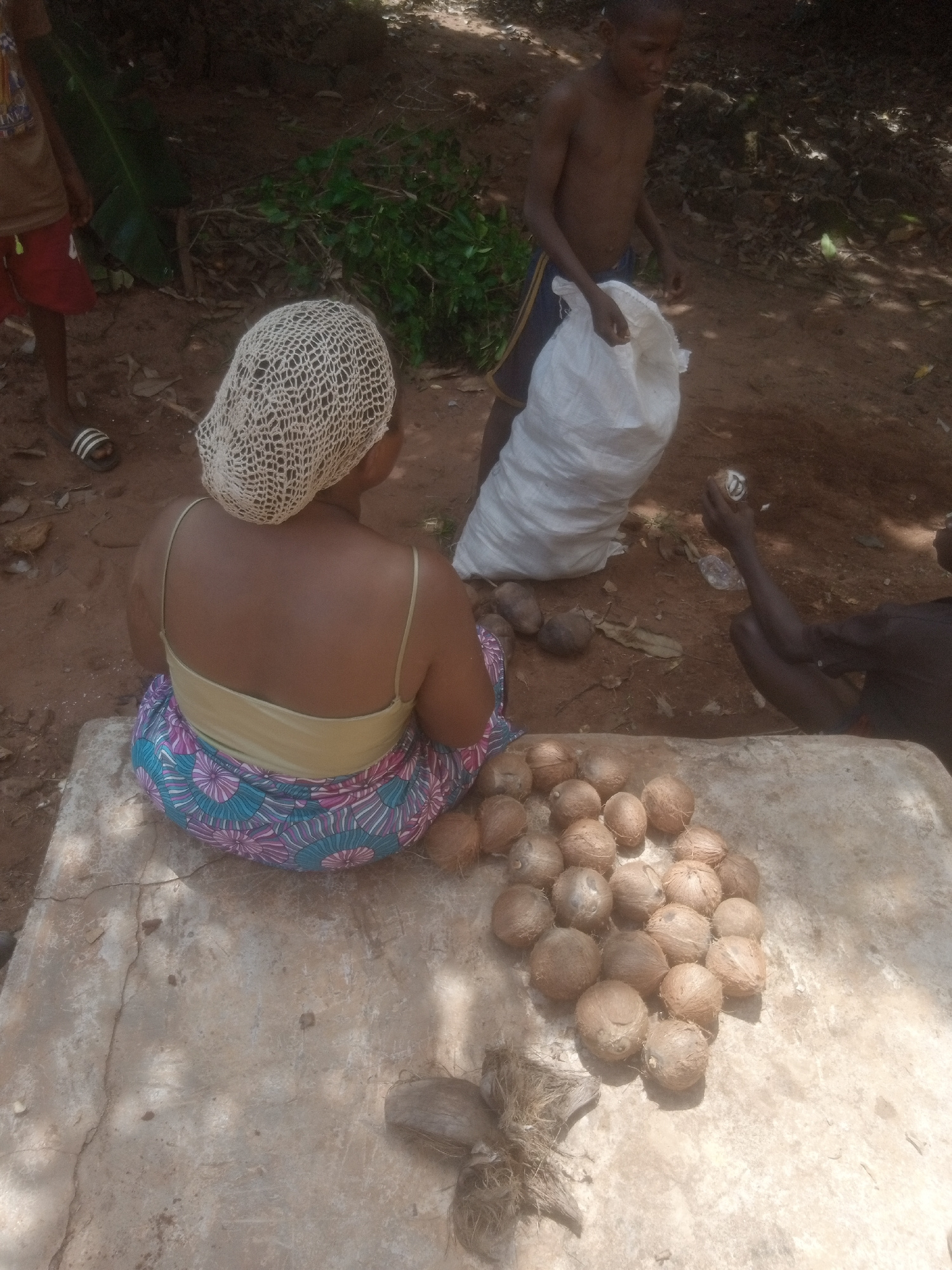 In Ukwu-Abwa, Nigeria, a woman with a tan back and a white netted head covering sits on a concrete surface. She wears a light yellow top and a patterned skirt with blue and pink floral designs. In fro…read more
