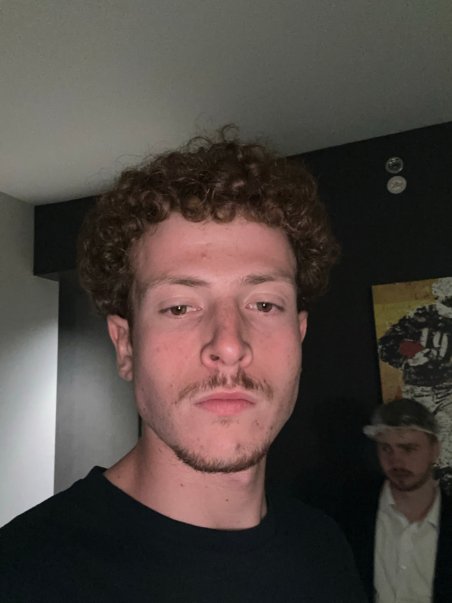 A man with curly brown hair and a mustache is facing the camera. He is wearing a black shirt. Behind him is a dark wall with two round objects mounted near the top. A piece of artwork is also visible…read more