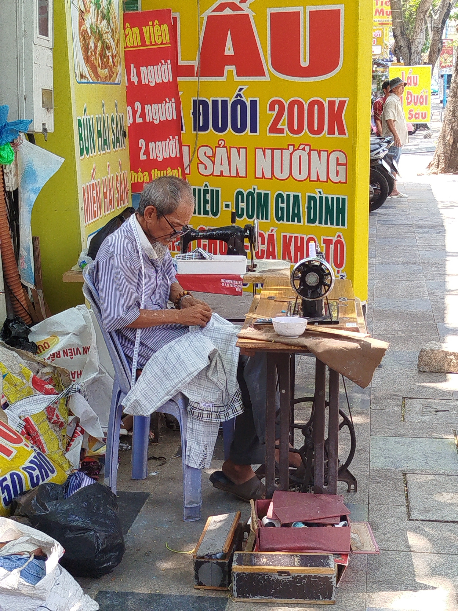 An elderly man in Ho Chi Minh City, Vietnam, is seated on a blue plastic chair, meticulously hand-sewing a plaid garment. A measuring tape is draped around his neck. He is positioned next to an antiqu…read more