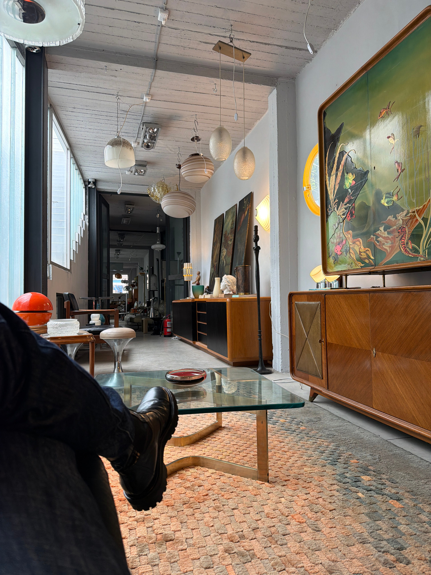 The image captures an indoor scene, likely a showroom or gallery, viewed from a seated perspective. The foreground features a person's legs, clad in dark jeans and sturdy black boots, resting on or ne…read more