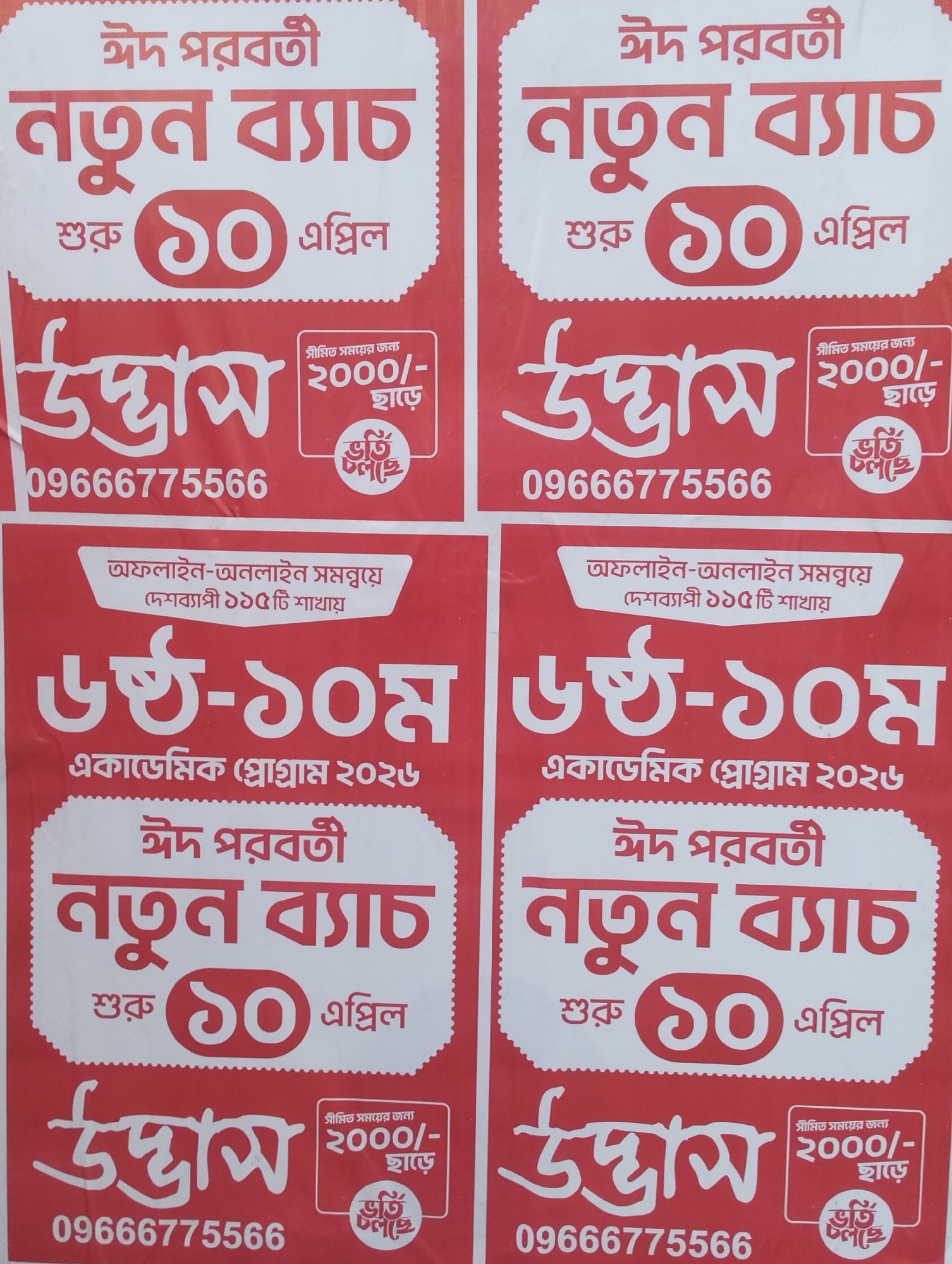 The image shows four identical posters in Bengali script. The posters advertise a new batch of classes starting April 10th, subsequent to the Eid holiday. The classes are for grades 6-10 under the aca…read more