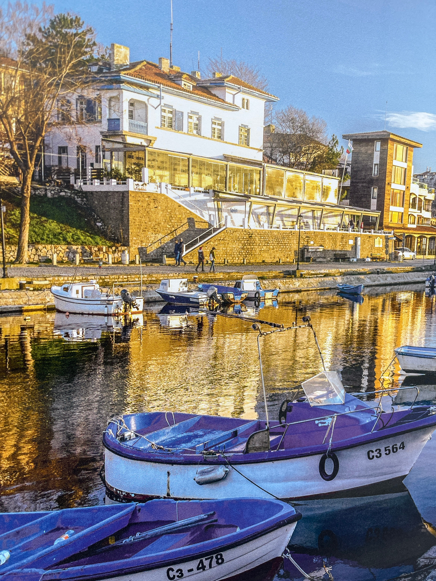 The image depicts boats docked in a canal in Burgas, Bulgaria. The boats, painted white and blue, are registered with codes "C3-478" and "C3-564." The water reflects the sunlight and the buildings onβ¦read more