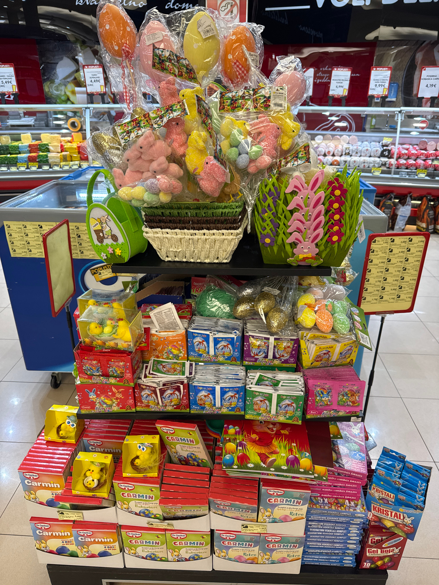 This image captures a vibrant display of Easter-themed merchandise within what appears to be a retail store, likely a supermarket or grocery store. The photo is rotated, showing the items on their sid…read more