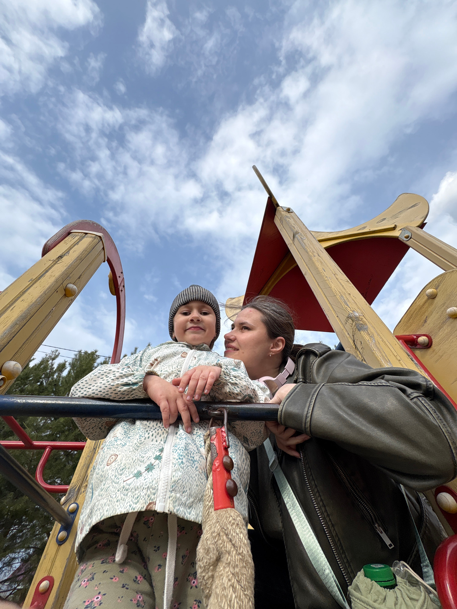 A low-angle photograph shows a woman and a child on a playground structure, possibly in Chaikovsky, Russia. The woman, wearing a dark jacket and with her hair tied back, looks toward the child. The ch…read more