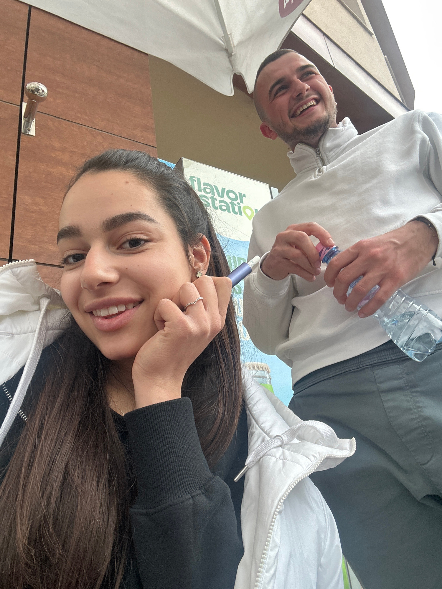 A casual, brightly lit photograph features two individuals, a man and a woman, smiling directly at the camera. The image appears to be taken from a slightly low angle, capturing the man from an overhe…read more