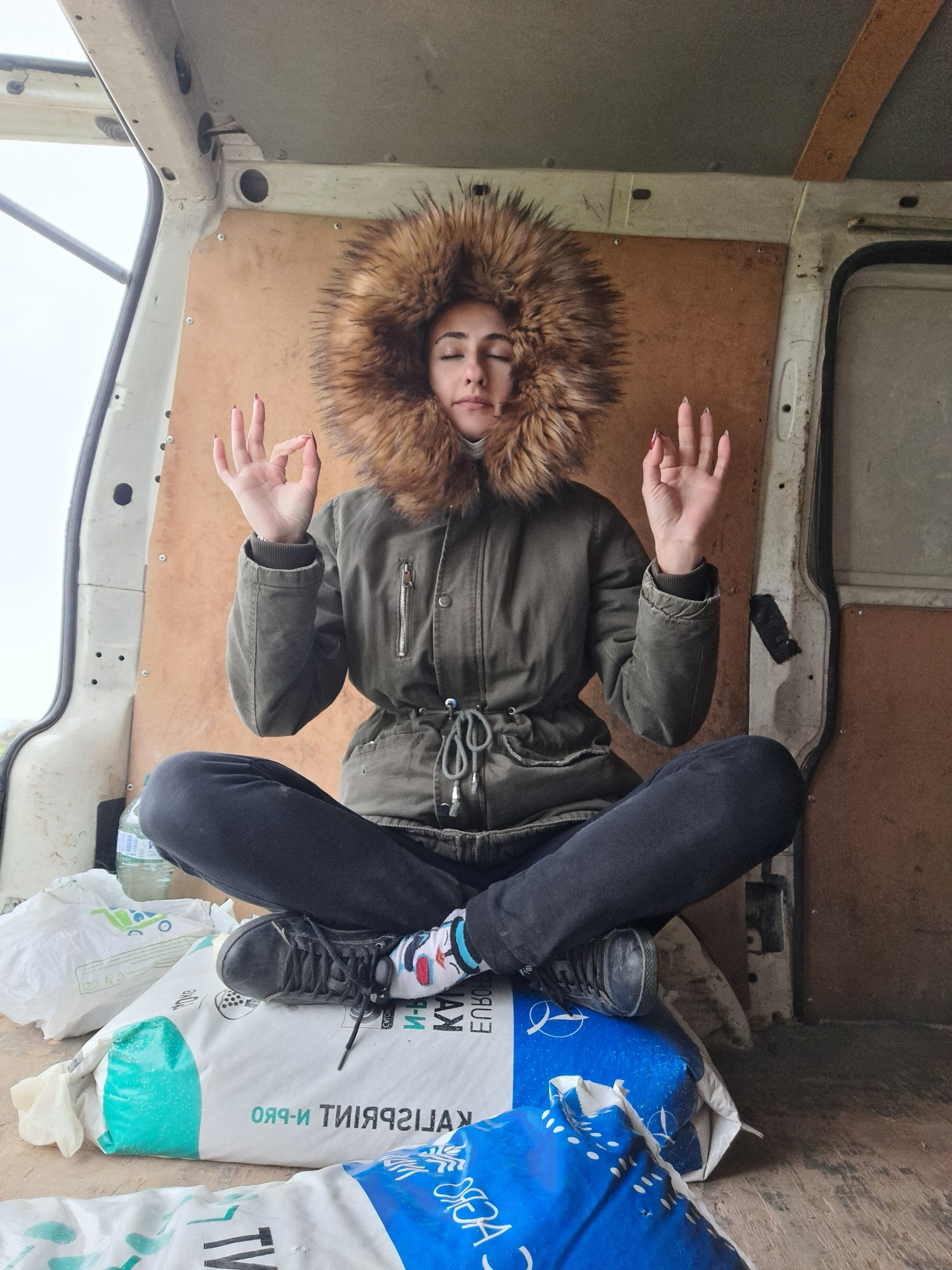The image shows a person lying down inside what appears to be the back of a van or enclosed vehicle. The person is wearing a green jacket with a fur-lined hood, black pants, and black sneakers with pa…read more
