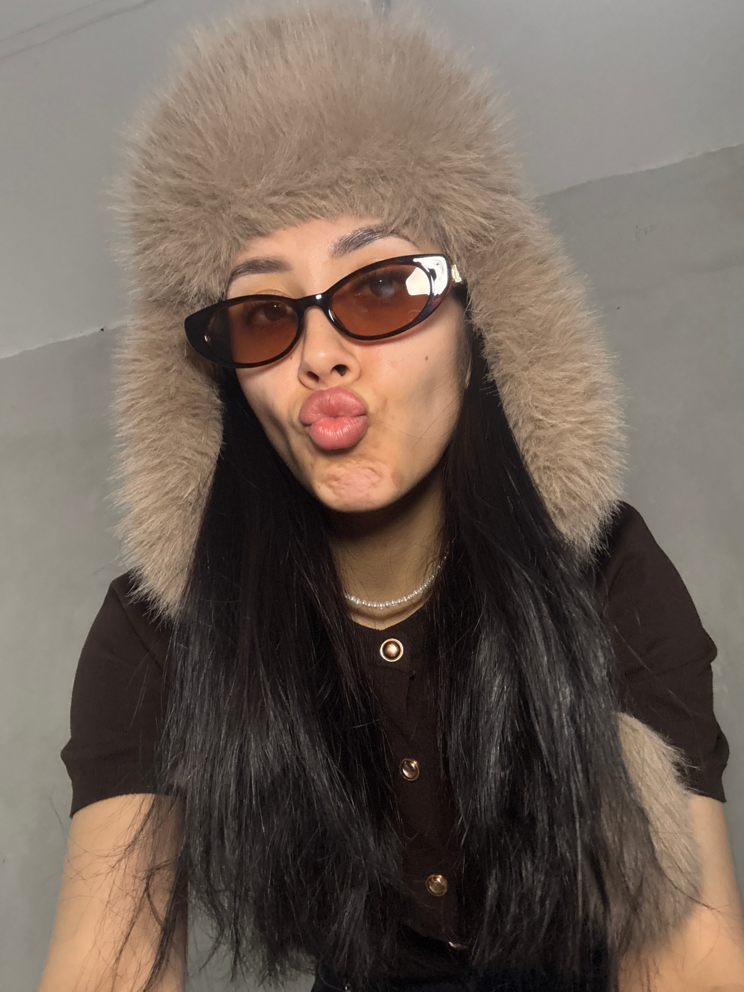 A young woman is captured in a medium close-up, tilted portrait against a plain, light grey background. She has long, straight dark hair that flows around her. Her face is framed by a voluminous, ligh…read more
