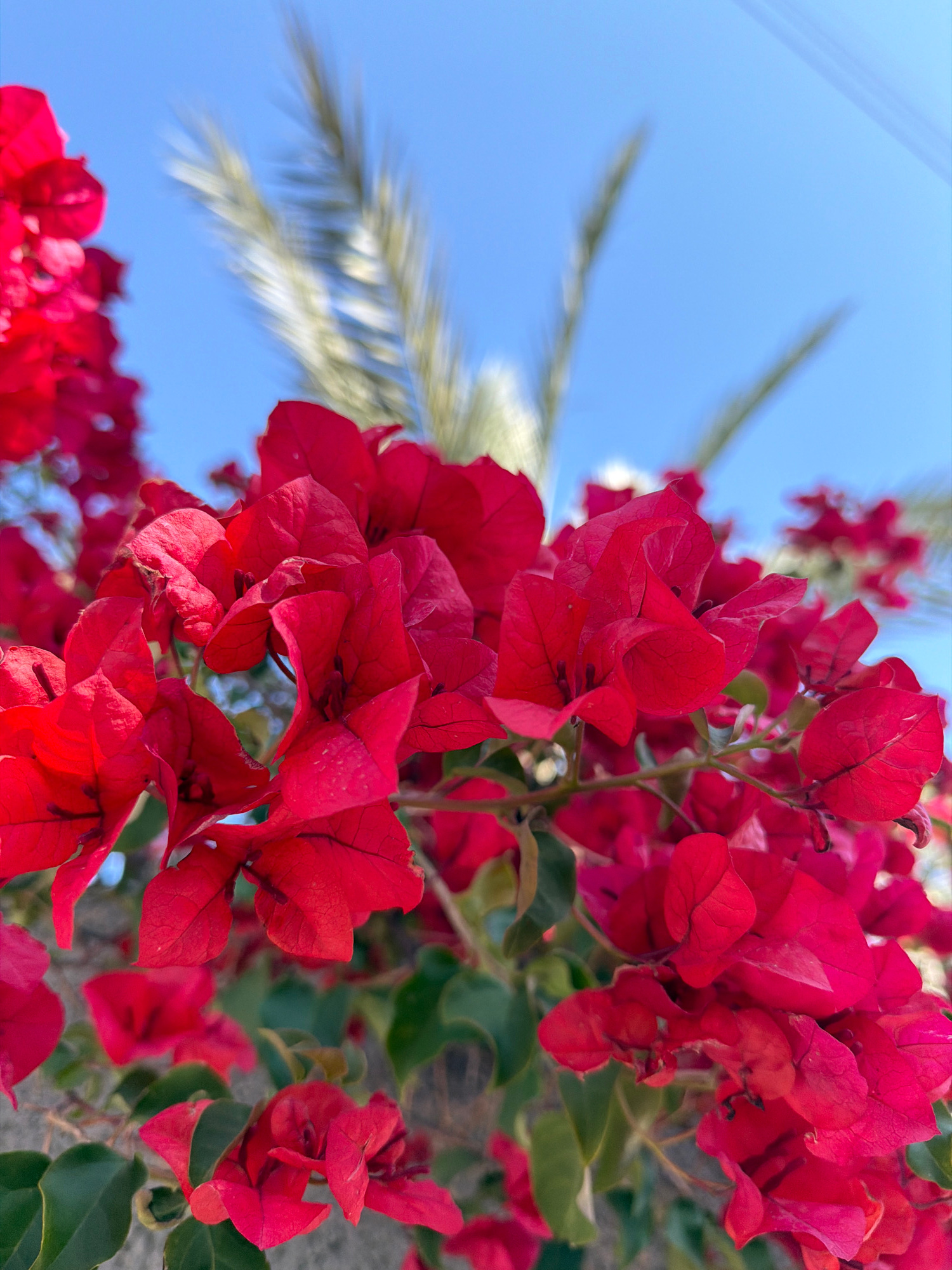 The image captures a close-up, upward-angled view of a dense cluster of vibrant red bougainvillea flowers and their associated green foliage, brightly illuminated by natural daylight. The setting is a…read more