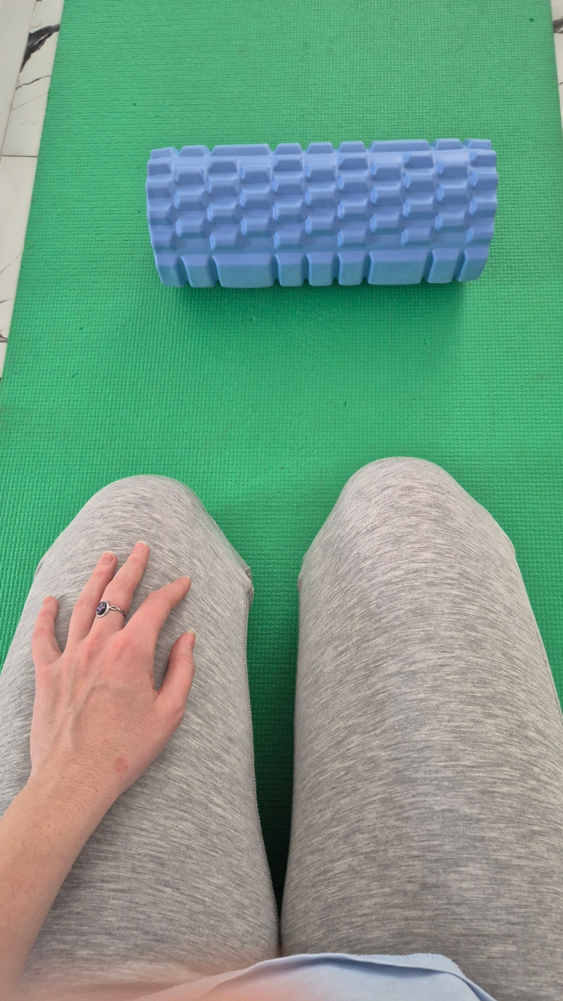 The image shows a green yoga mat on a white tiled floor. A blue foam roller sits to the left of a person wearing grey leggings, whose hand rests on their leg. The image provides no information to indi…read more