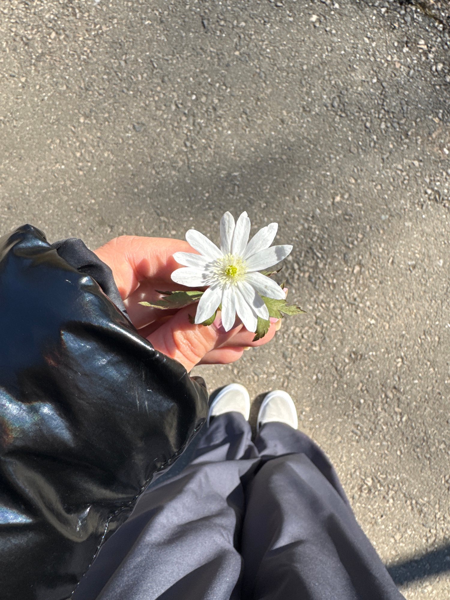 A person holds a white flower with a yellow center in their hand. The person is wearing white shoes, gray pants, and a shiny black jacket. They are standing on a paved road. The location is unknown.