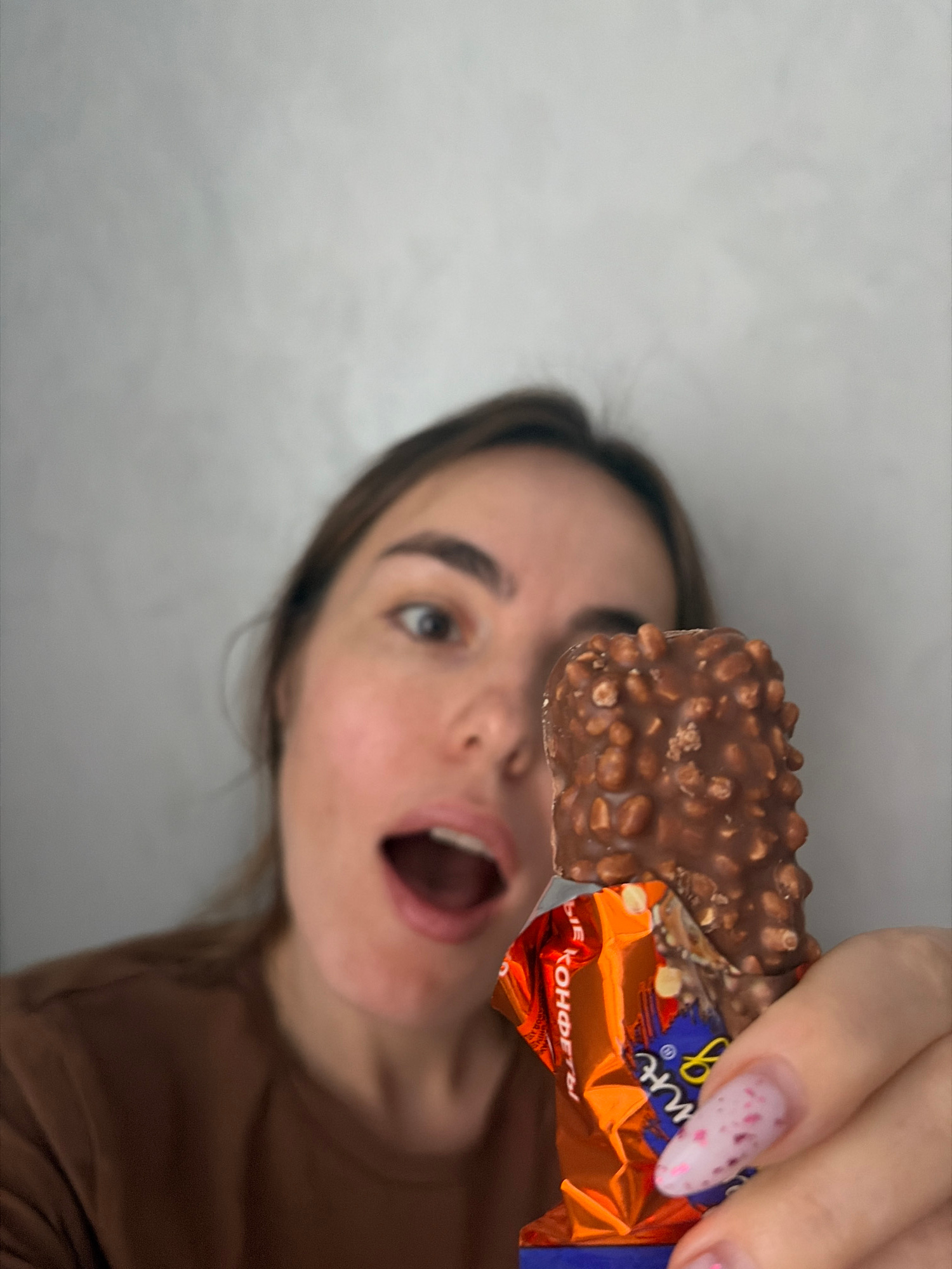 A woman with light skin and brown hair holds a chocolate bar in front of her face with her right hand. The chocolate bar has a rough, nut-covered surface. The woman's mouth is open as if she is about…read more