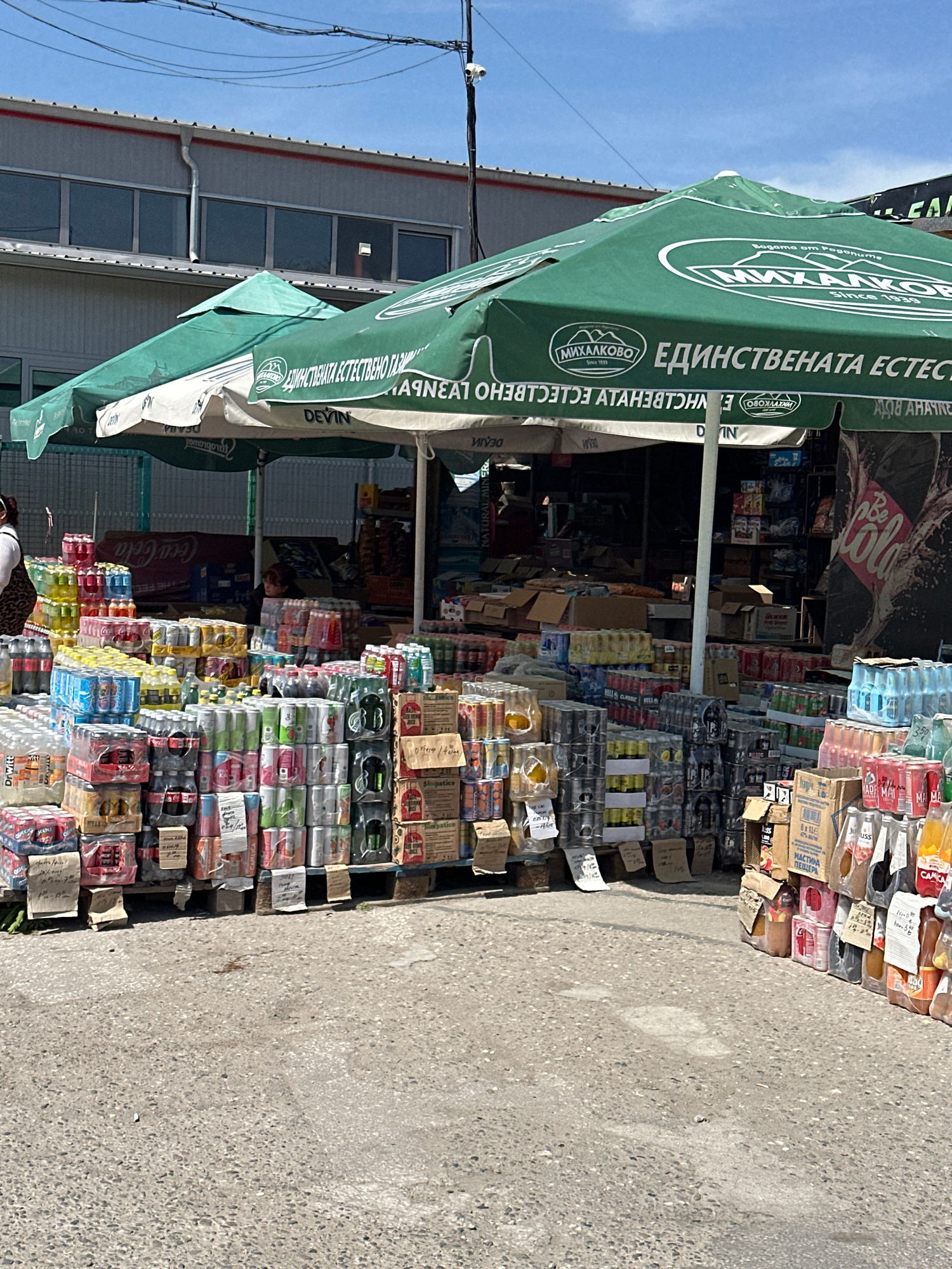 This media file captures an outdoor beverage stall or shop, likely operating roadside in Plovdiv, Bulgaria, given the provided location context and visible Cyrillic text. The scene is bright, indicati…read more