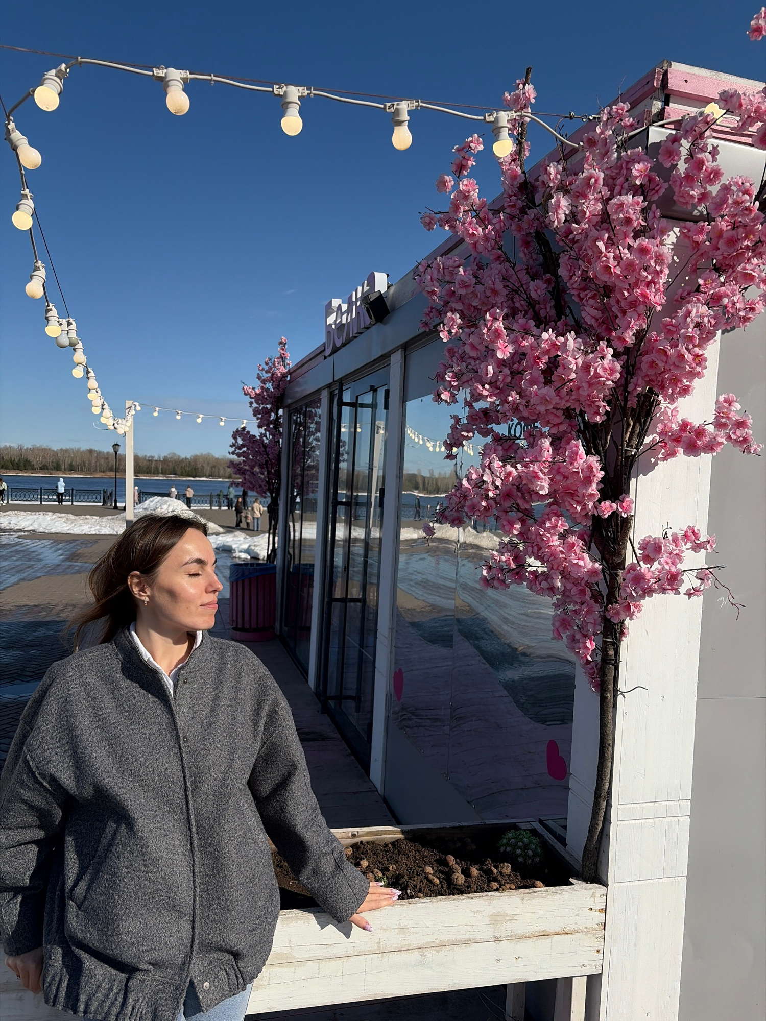 A medium-shot, candid image shows a woman positioned outdoors, looking upward with her eyes closed. She wears a gray jacket over a white collared shirt. A strand of incandescent light bulbs is visible…read more
