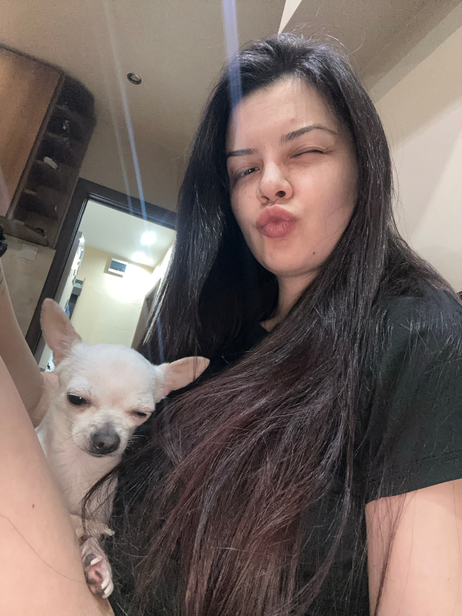 A photograph shows a woman and a dog in an indoor setting. The woman has dark hair and is wearing a black shirt. She is looking at the camera with her lips pursed. A small, light-colored dog is nestleβ¦read more