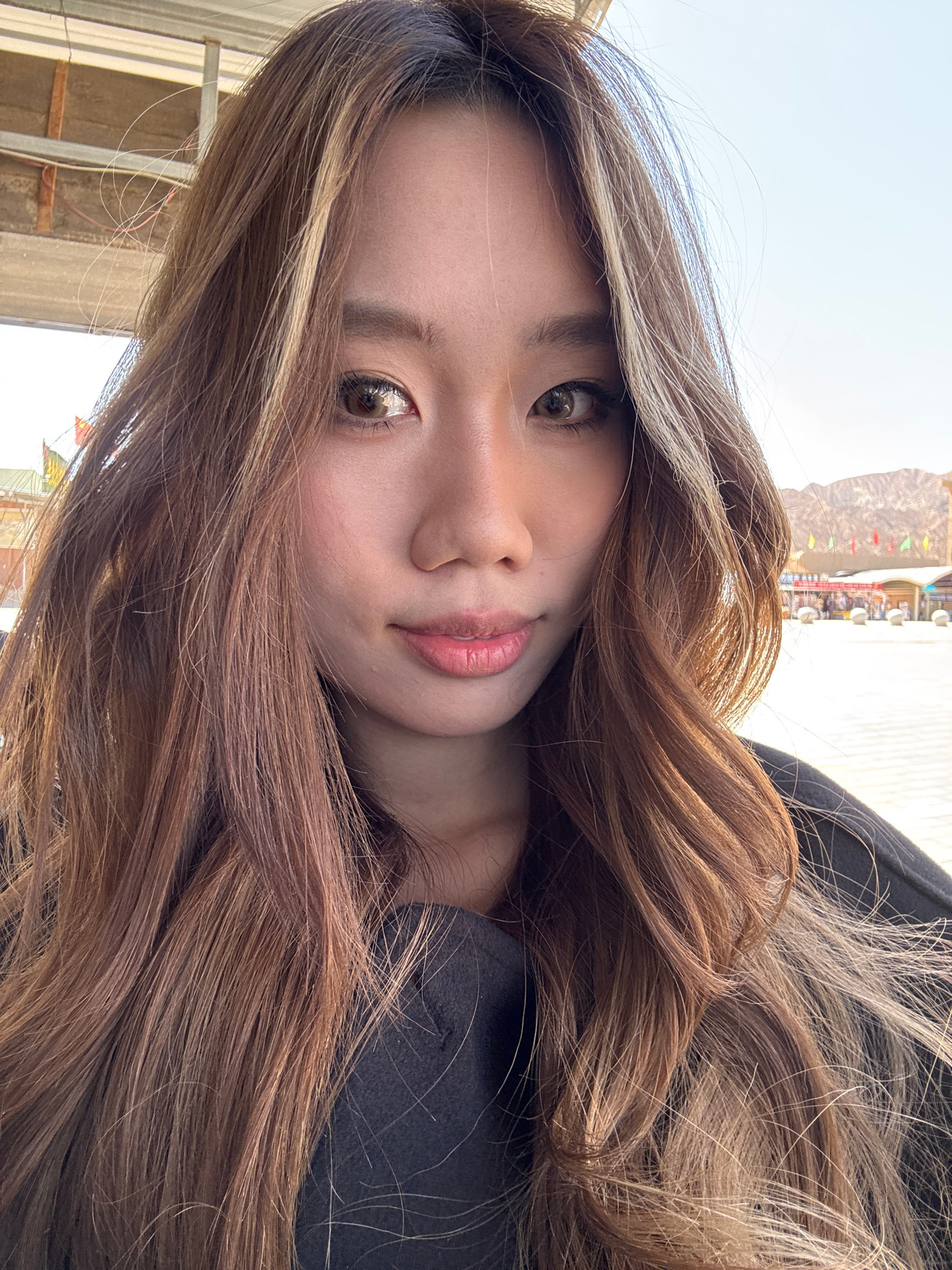 The image is a close-up, vertically oriented (rotated 90 degrees counter-clockwise) portrait of a young woman, likely a selfie. She has long, voluminous, wavy hair in multiple shades of brown with pro…read more
