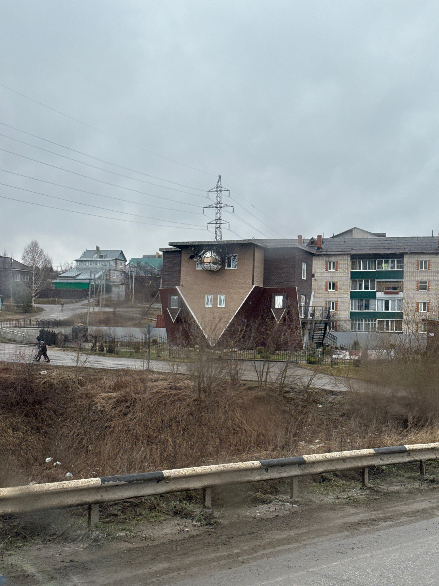 The image captures a somber, overcast day in what appears to be a residential or semi-urban area of Filippovka, Russia. The sky is a uniform light grey, indicating heavy cloud cover. In the mid-groun…read more
