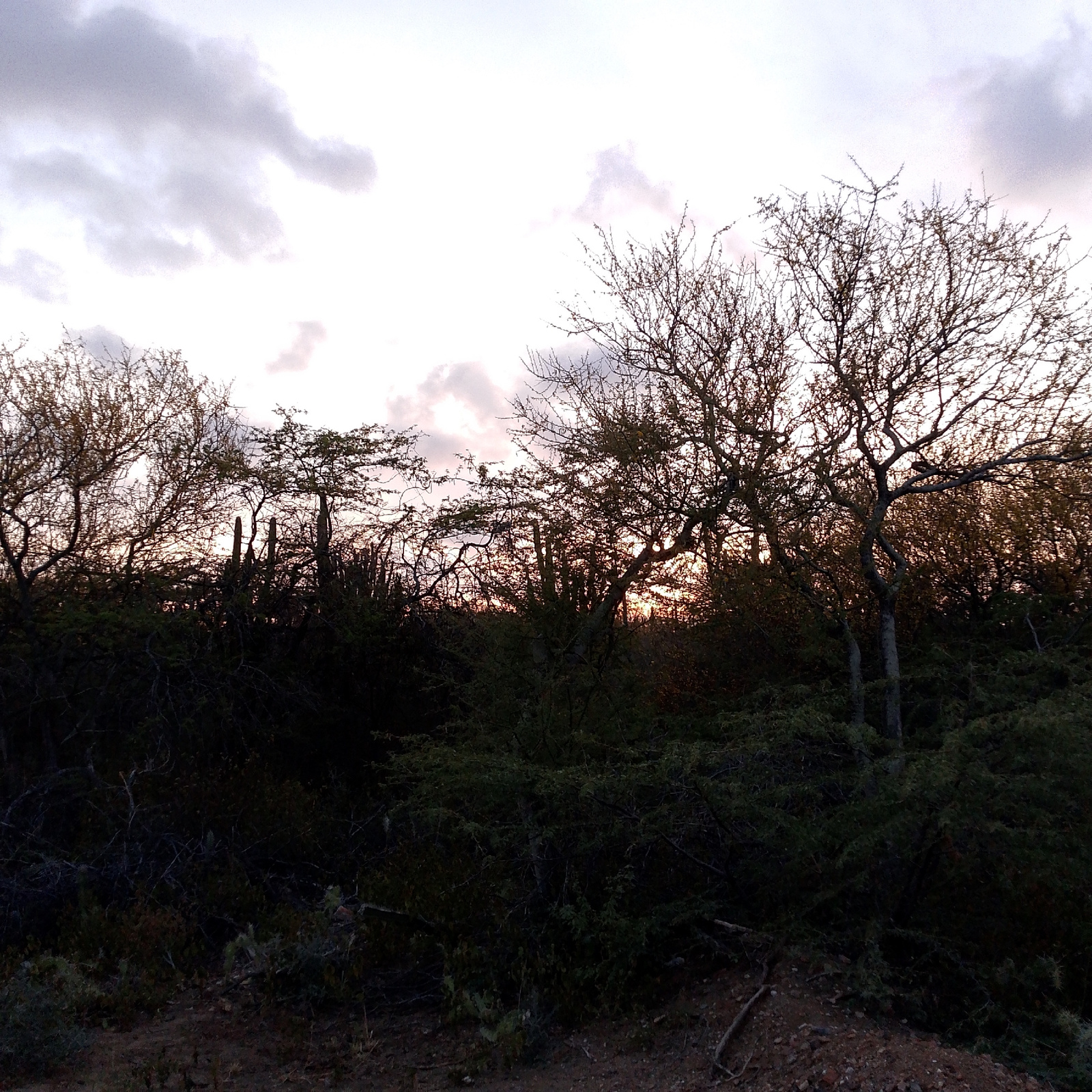 The image captures a landscape at dusk, likely in a rural or natural setting. A line of trees and shrubs, some with bare branches, are silhouetted against a pale sky with scattered clouds. The ground…read more