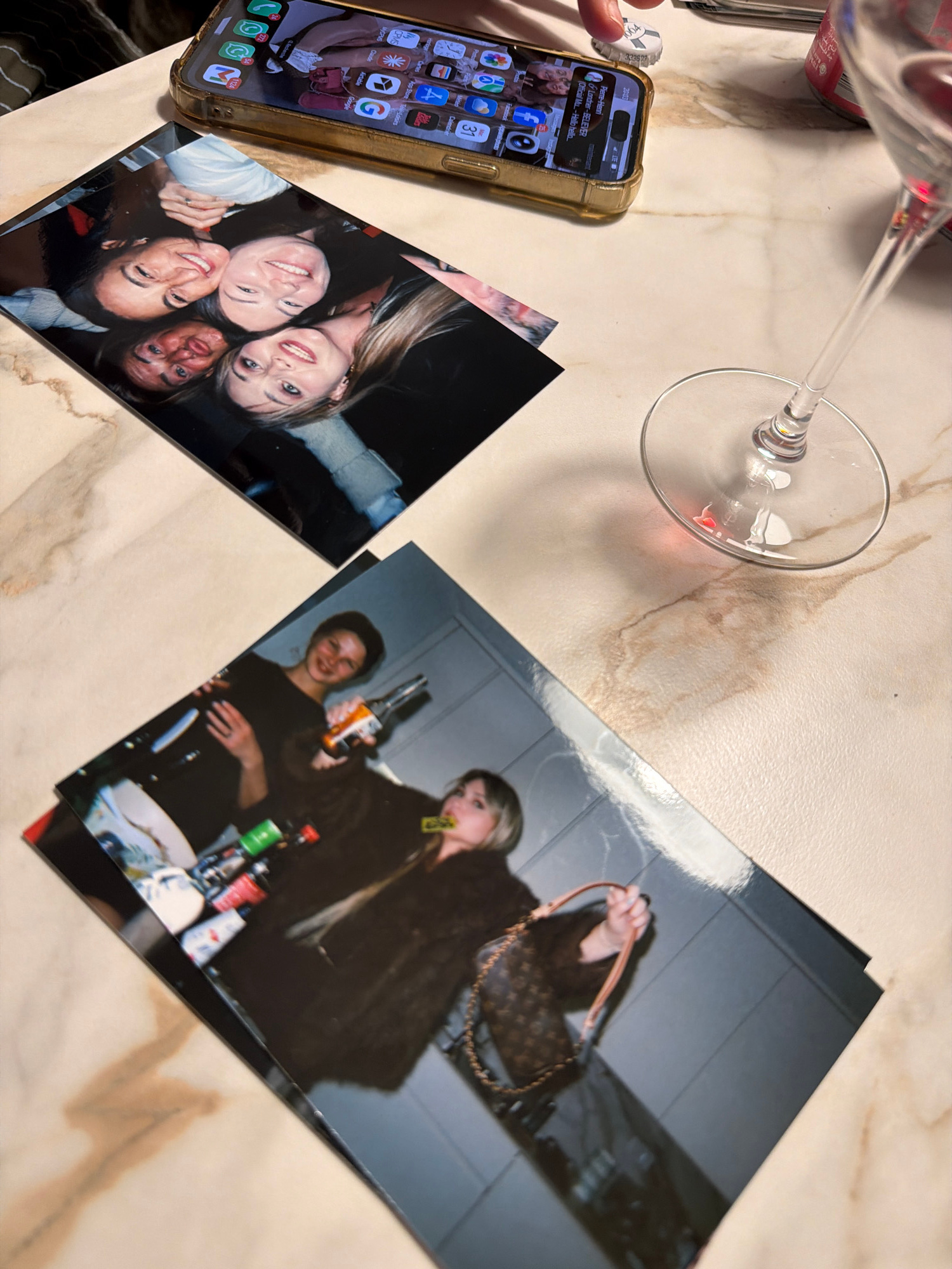 The image shows a countertop with several items scattered on it. There is a smartphone with a gold-colored case displaying the home screen with various app icons. Next to the phone are two printed pho…read more