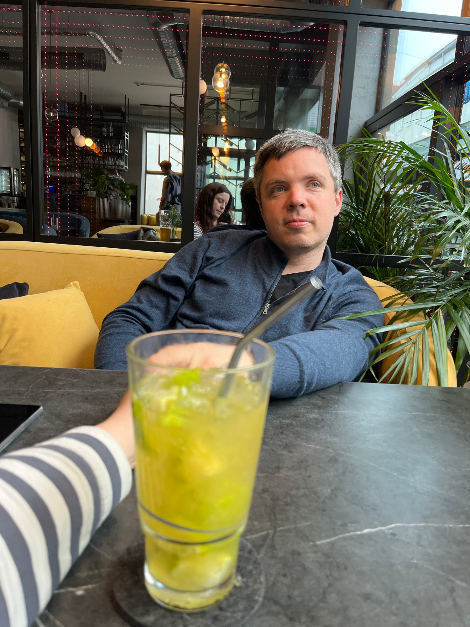 The image shows a man sitting at a dark-colored table inside what appears to be a restaurant or bar, based on the interior design. He is wearing a blue hooded jacket and has short, graying hair. In fr…read more