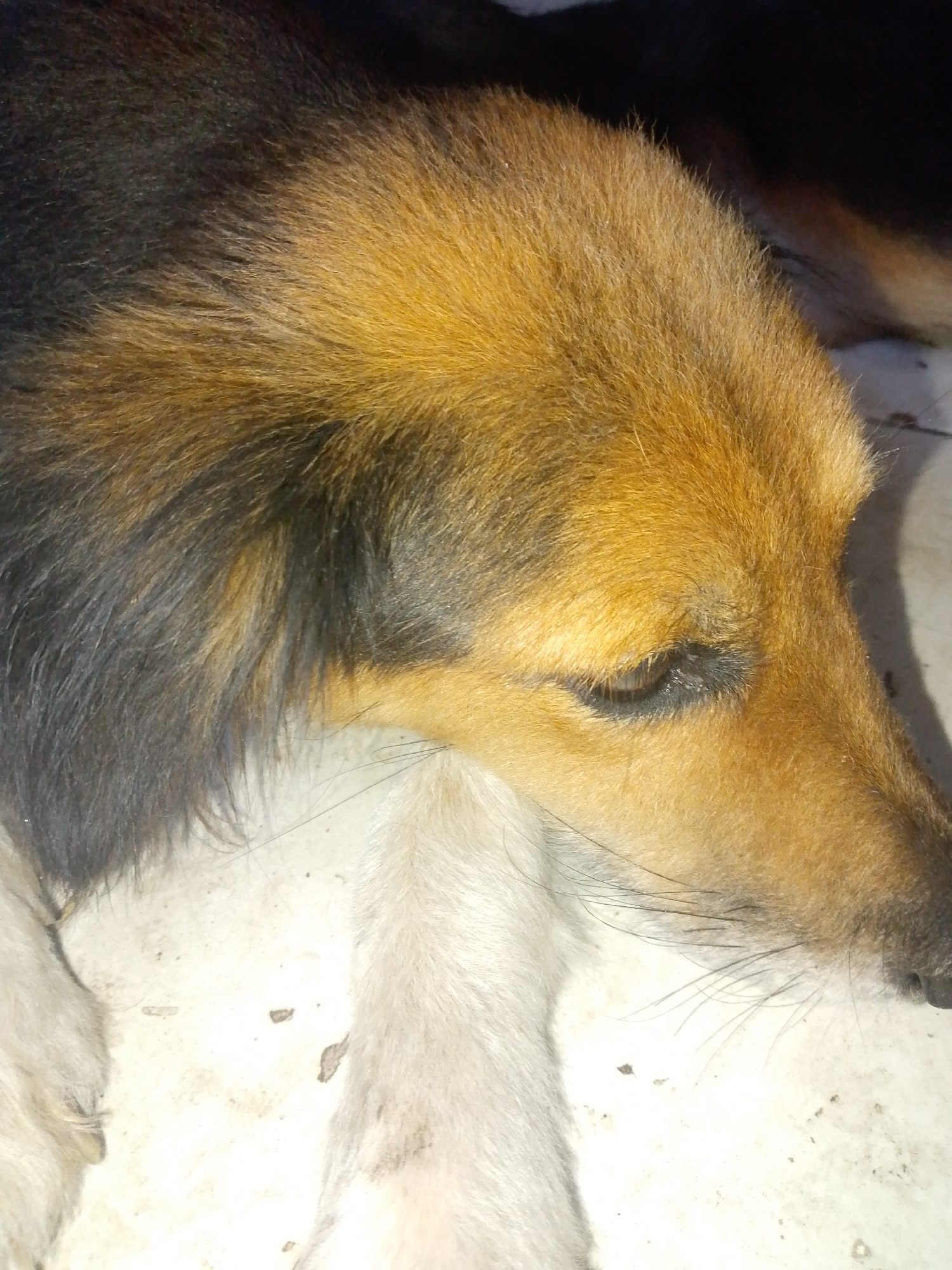 A close-up shows a medium-sized dog lying on a light-colored surface, possibly indoors. The dog has short, dense fur that transitions from black on its head and back to golden brown around its face, e…read more
