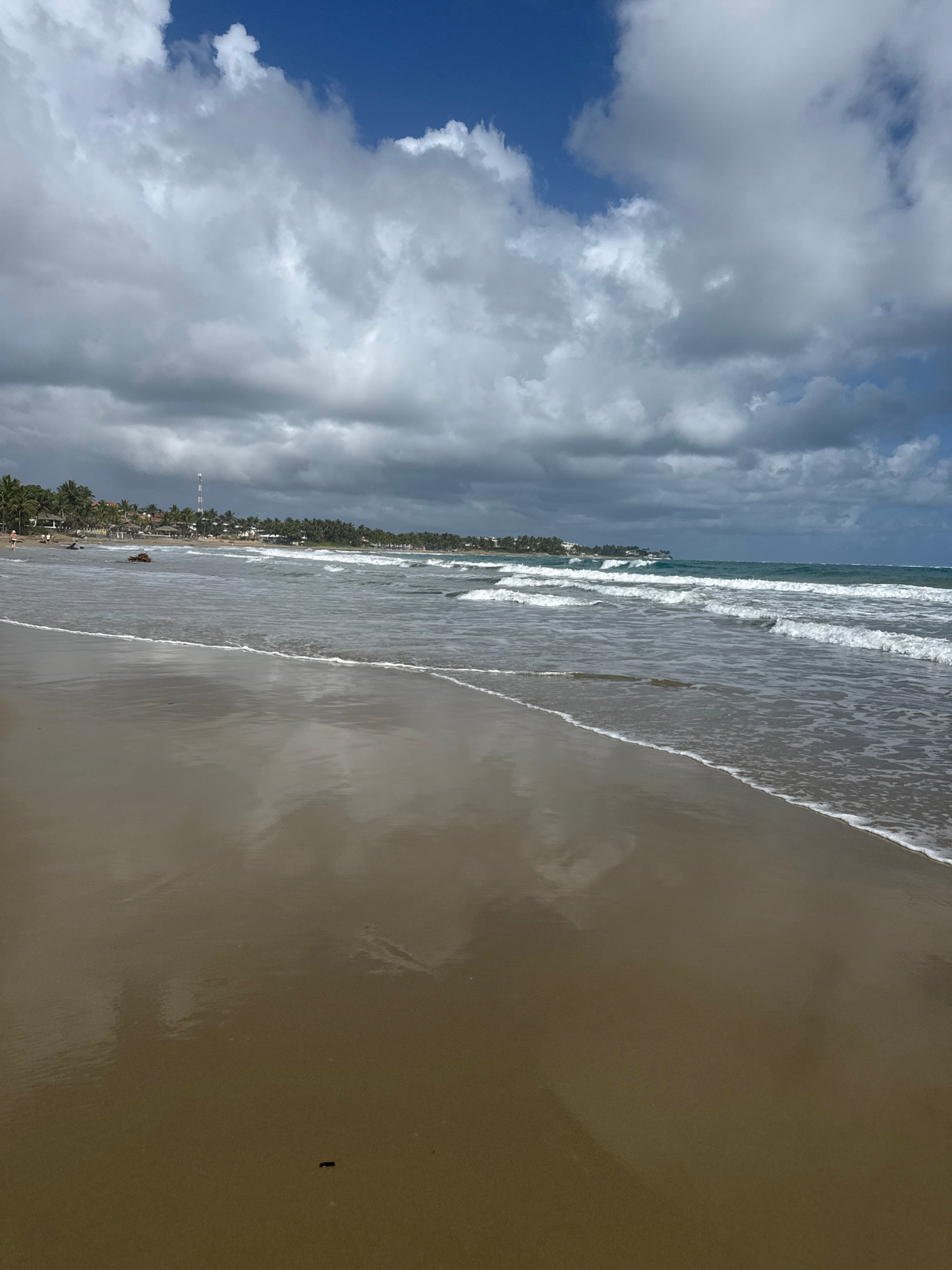 The image shows a beach scene in Cabarete, Dominican Republic. The sky is partly cloudy with a mix of blue sky and white and dark gray clouds. The beach is wide with tan sand. Waves are visible as the…read more