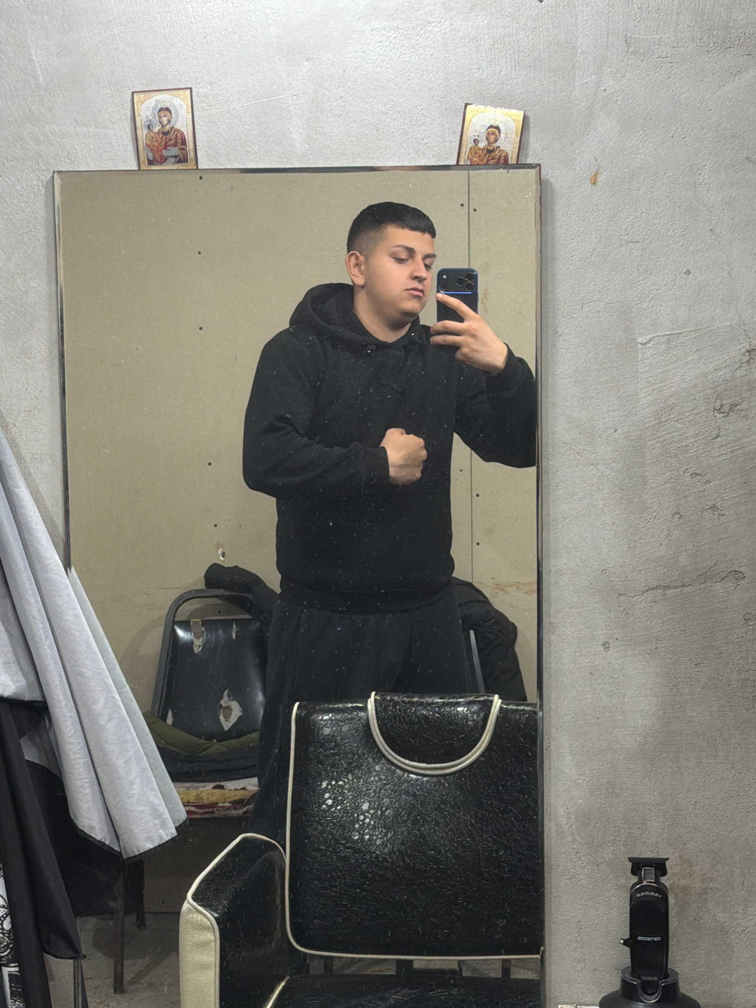 The image shows a man in a black hoodie taking a selfie in a mirror. The mirror is attached to a wall next to two religious icons. A barber chair and a clipper are visible near the mirror. The setting…read more
