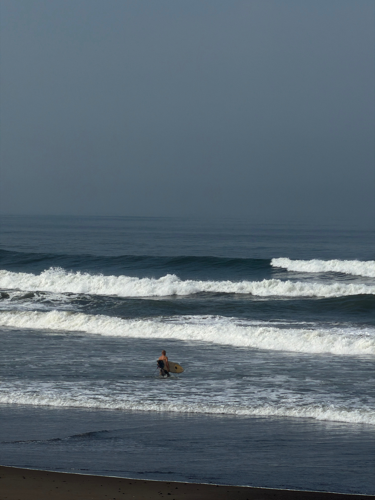 The image captures a beach scene in Belalang, Indonesia, under an overcast sky. The sky, a uniform grey-blue, occupies the upper third of the frame, transitioning to the darker grey-blue of the ocean.…read more