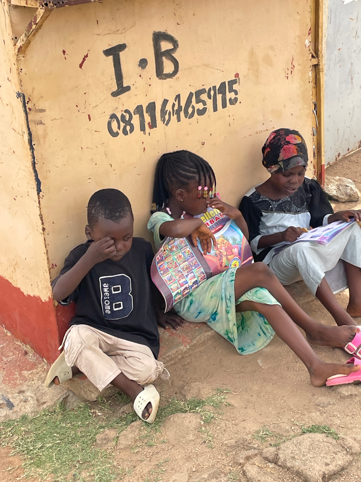 Three children are lying on the ground next to a yellow wall with black lettering that reads "I.B. 08116465115". The children are oriented at various angles, their bodies partly overlapping. The child…read more