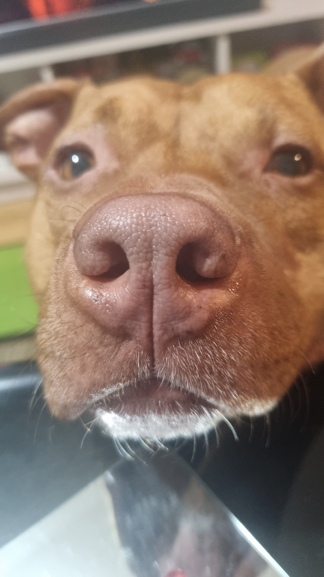 A close-up photograph shows the face of a light-brown dog. The dog's nose is prominently featured, with visible nostrils and textured skin. Two eyes are also visible, suggesting the dog's head is tilt…read more