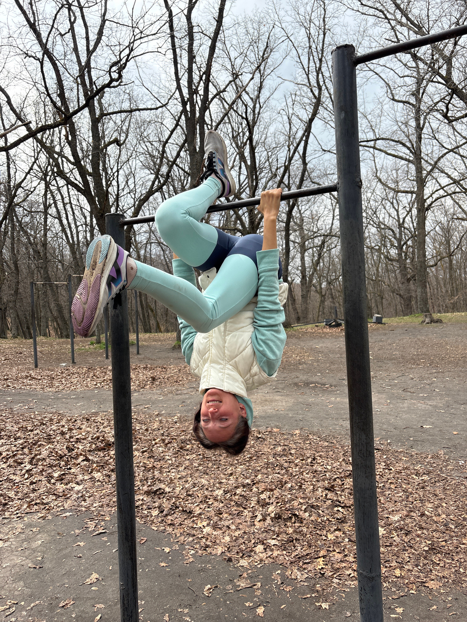 A woman balances on a metal playground structure. She wears athletic leggings, a light vest, and running shoes. The background shows bare trees and a ground covered in fallen leaves. The setting appea…read more