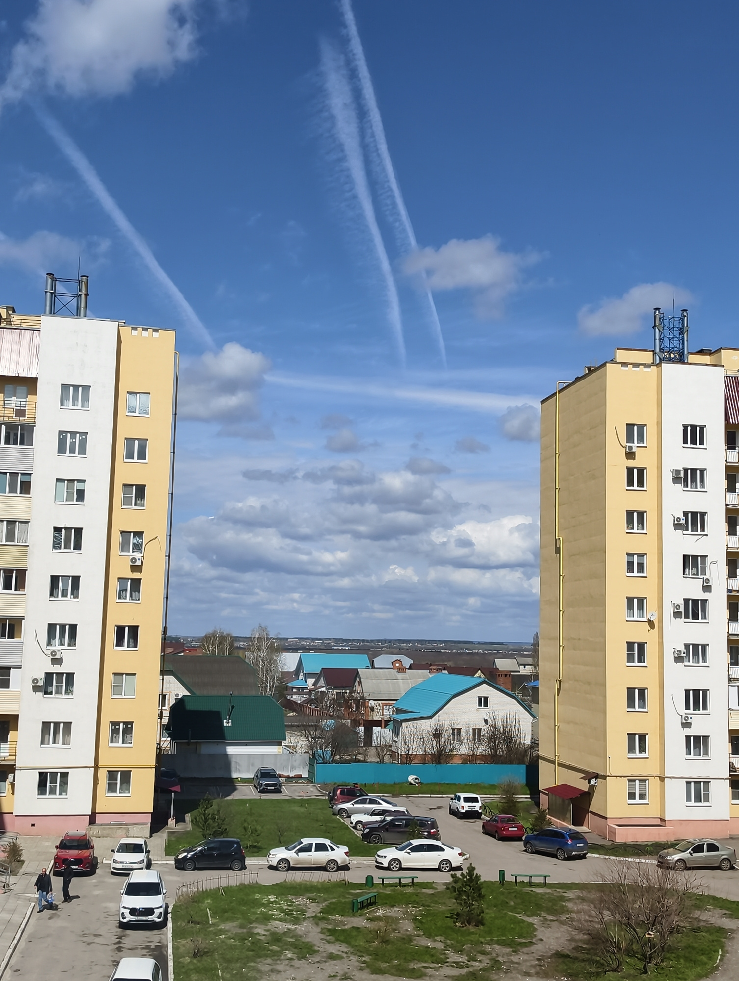 The image captures an elevated view of a residential area in Balashov, Russia, under a bright blue sky dotted with scattered white clouds and prominent aircraft contrails. Two multi-story apartment bu…read more