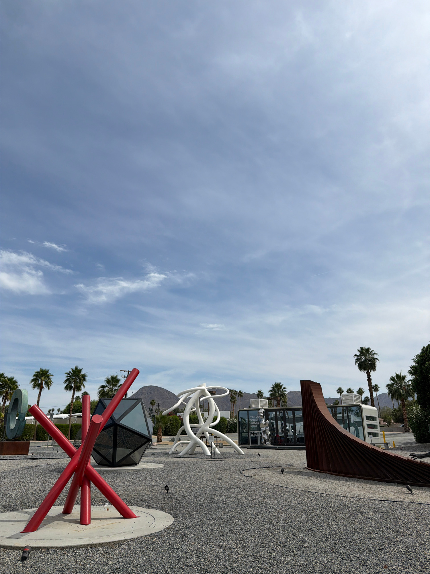 The image depicts a public space in Palm Desert, California, featuring several modern art installations. A prominent sculpture in the foreground consists of red cylindrical rods intersecting in an abs…read more