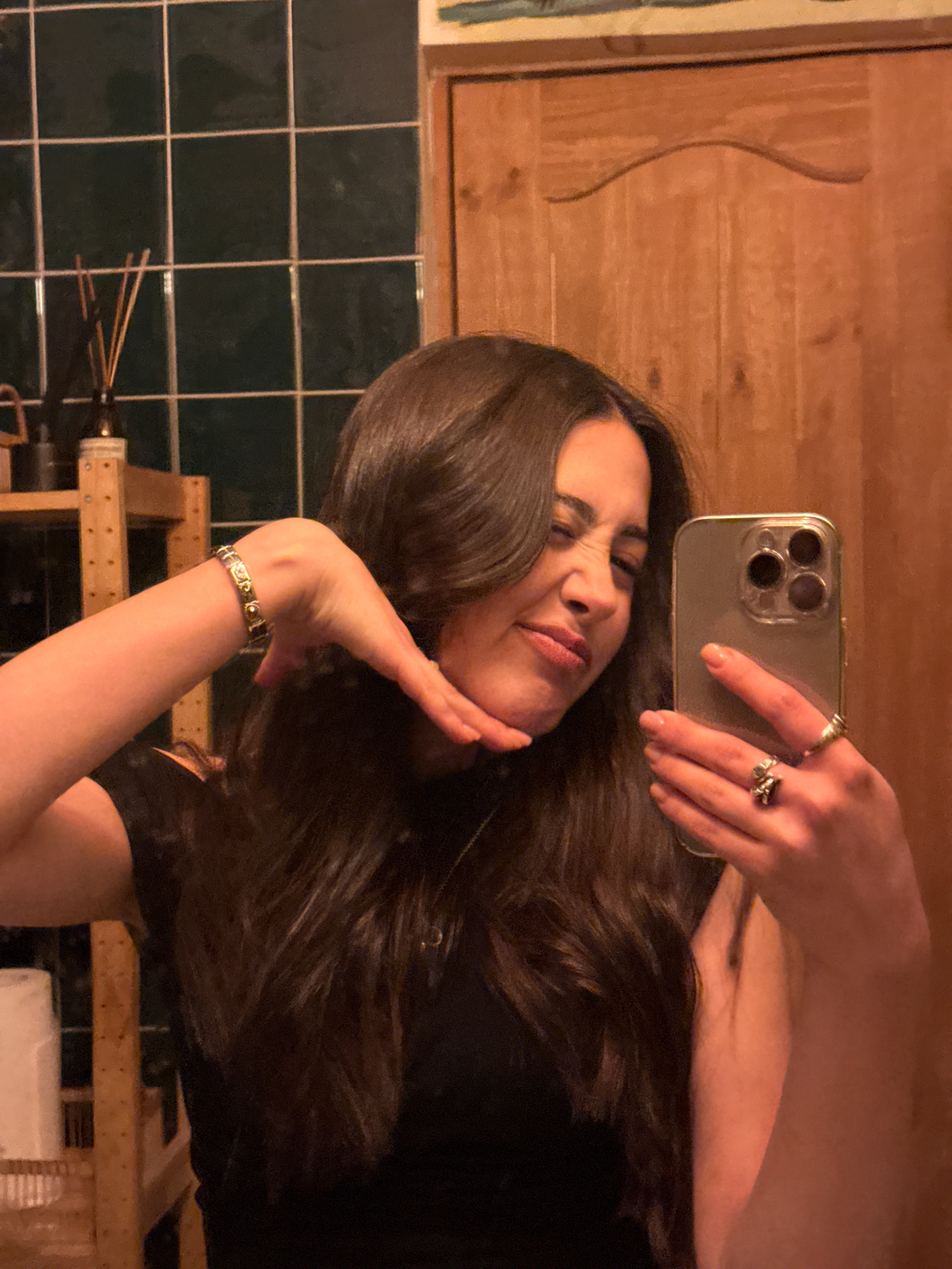 A woman is taking a selfie in a bathroom with green tiles. She is holding an iPhone in her right hand and her left hand is near her face. She is wearing rings on both hands and a bracelet on her left…read more