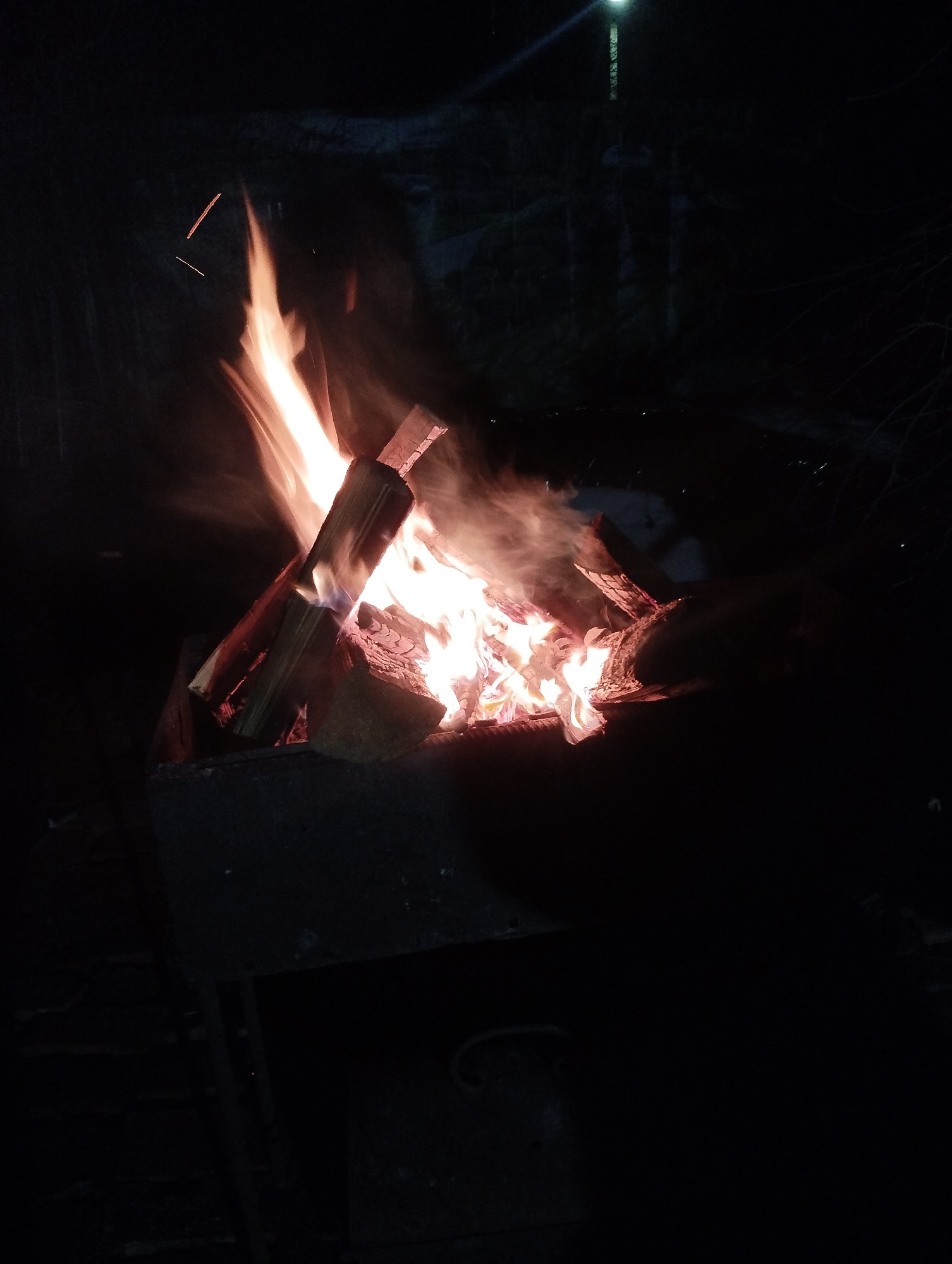 A nighttime scene depicts a bonfire in what appears to be a metal fire pit. The fire is actively burning, with prominent flames and smoke rising. The foreground is dark, obscuring details of the surro…read more