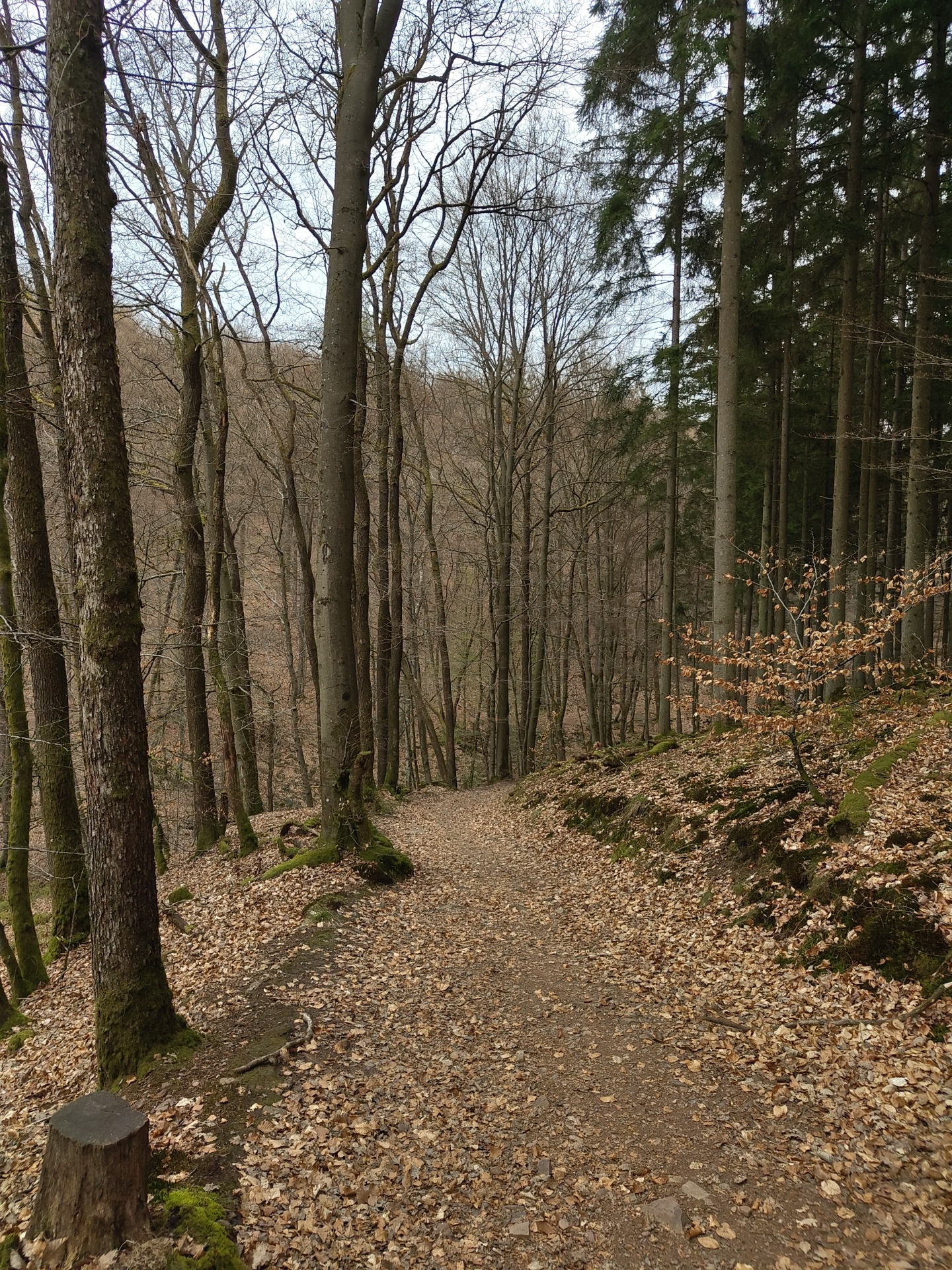 The image shows a forest path covered in fallen leaves, bordered by trees, possibly in late autumn or early spring. The trees on the left are predominantly bare deciduous trees, while those on the rig…read more