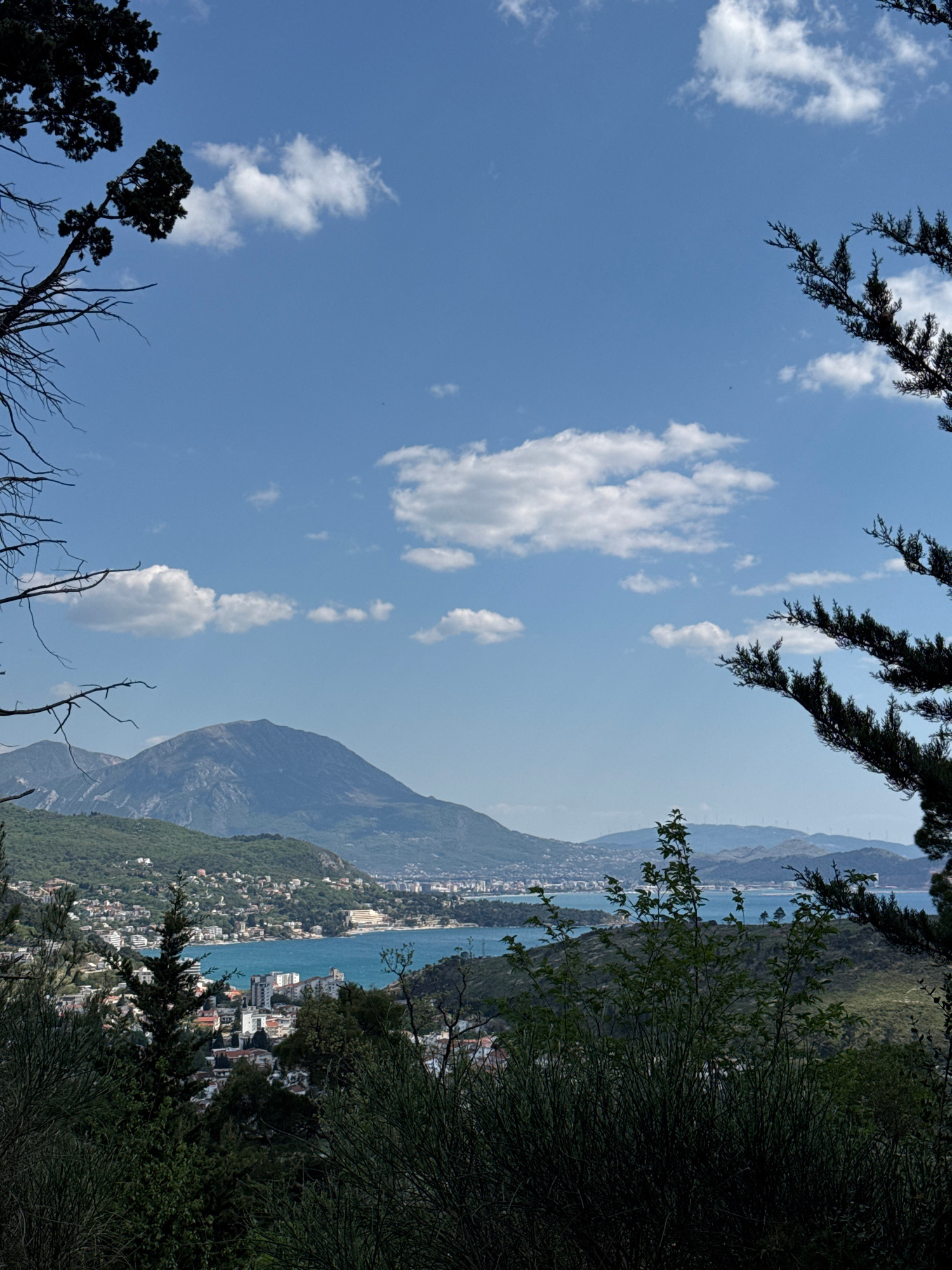 The image captures a view overlooking Sutomore, Montenegro. The perspective is from an elevated position, framed by foliage. In the distance, there is a body of water, possibly the Adriatic Sea, separ…read more