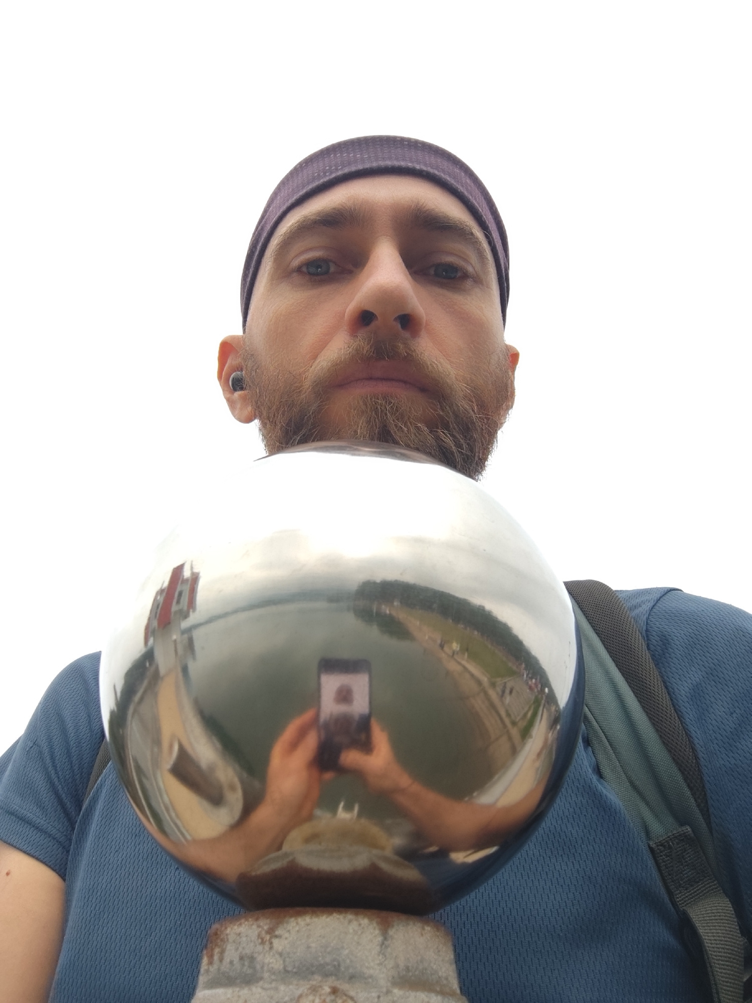 A selfie, taken from a low angle, shows a man with a beard and a dark purple headband, holding a reflective sphere. His blue shirt and backpack are visible. Reflected in the sphere is a water body, a…read more