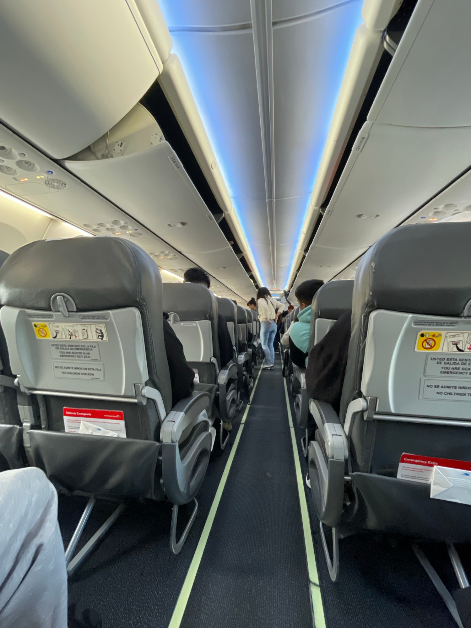 The original image captures the interior of an airplane cabin, rotated 90 degrees clockwise, presenting a view down a central aisle. Rows of dark grey passenger seats with black fabric backs line both…read more