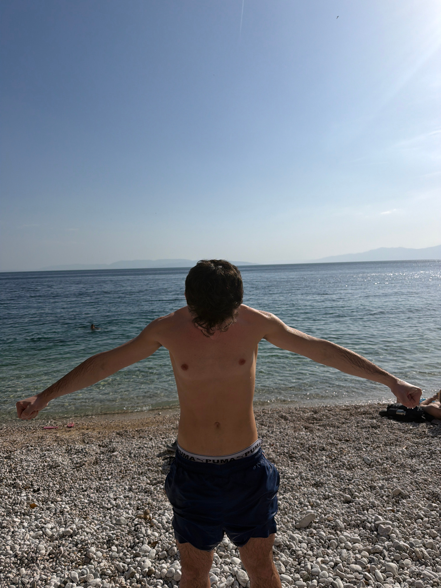 The image captures a bright, sunny beach scene, likely in Grad Rijeka, Croatia. The main subject is a person, appearing male, standing shirtless on a pebbly beach. They are wearing dark blue swim trun…read more