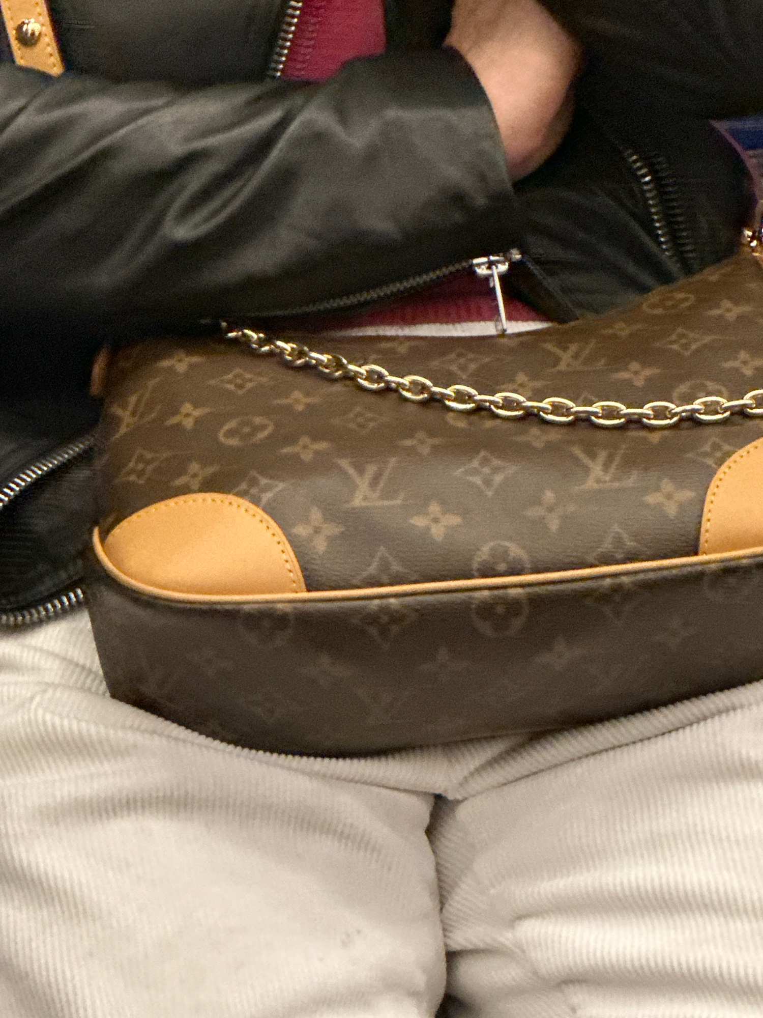 The image presents a close-up view of a person and a handbag, captured in what is understood to be London, United Kingdom. On the left, a person's arm is visible, encased in a black jacket made of a s…read more