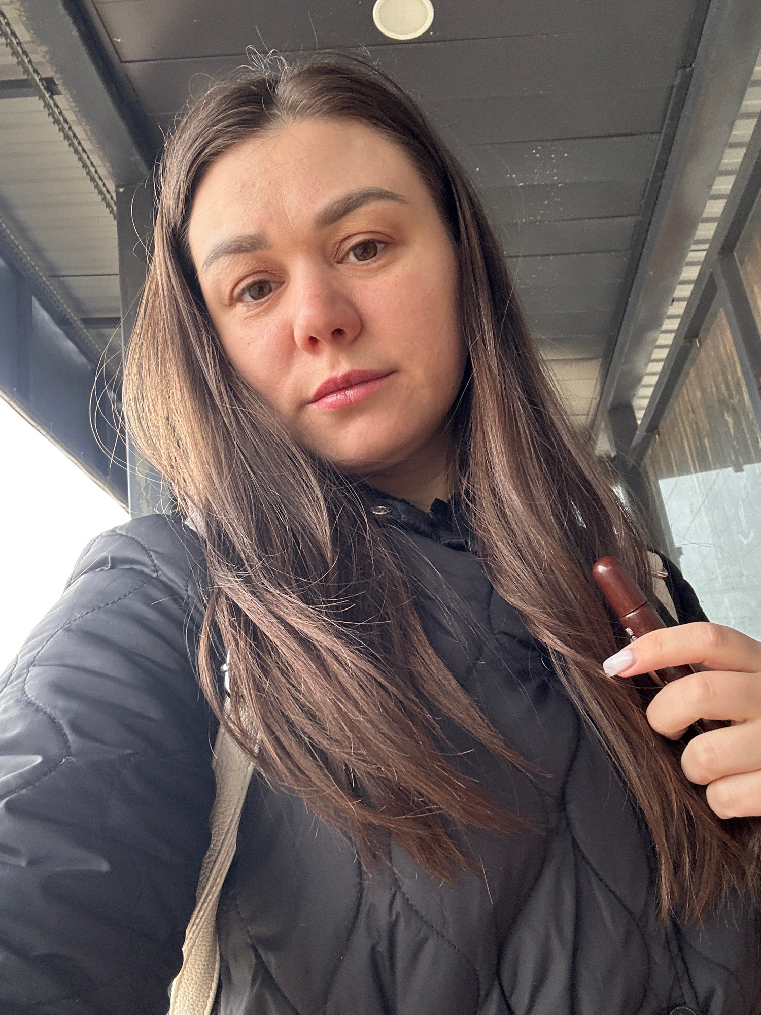 A woman with long brown hair is holding a brown lip pencil in her right hand. She's wearing a black puffer jacket with a cream-colored collar. The location appears to be in Chaikovsky, Russia, based o…read more